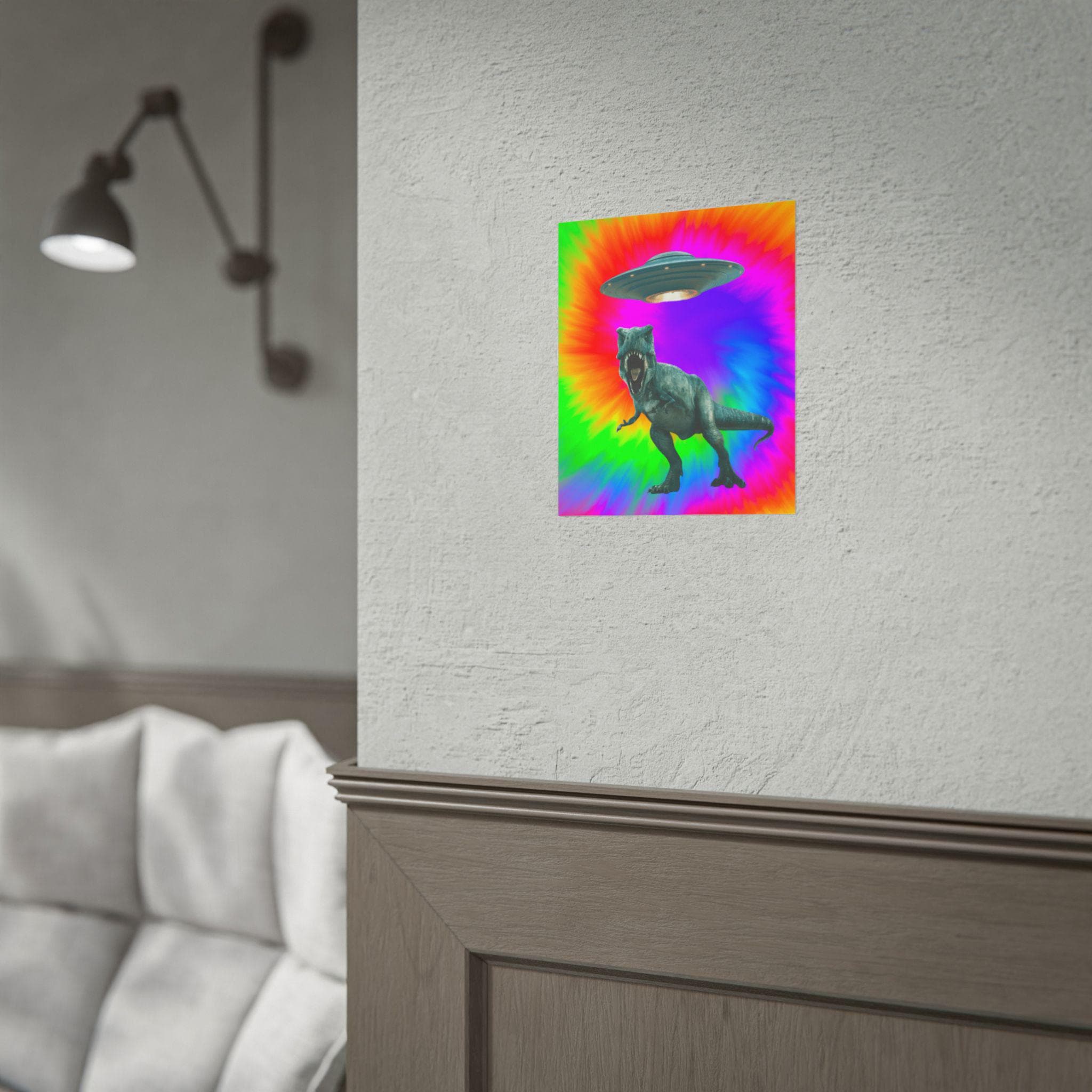 Transform your space with these vibrant rolled posters, perfect for adding a splash of color and a touch of fun to any room. Featuring a whimsical design of a roaring dinosaur beneath a flying saucer on a vibrant tie-dye background, these posters evoke a playful and adventurous vibe. Ideal for anyone who loves quirky art, this product fits seamlessly into a bedroom, dorm, or creative workspace, making it an excellent choice for decorating kids' rooms or personalizing your home office.