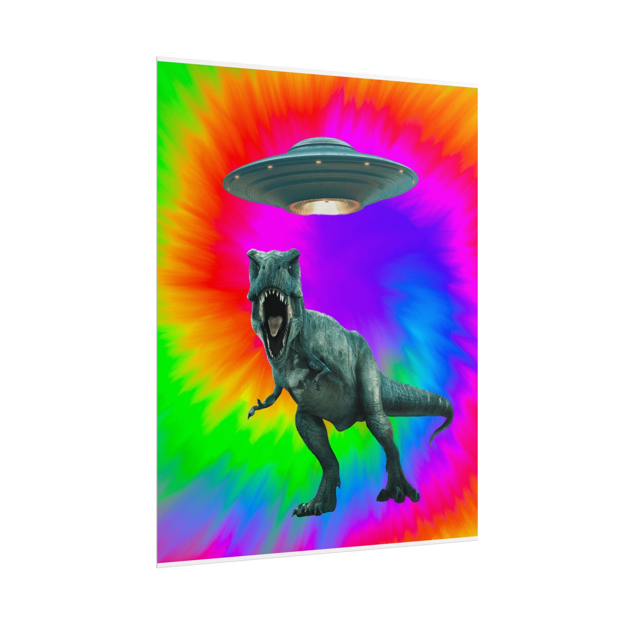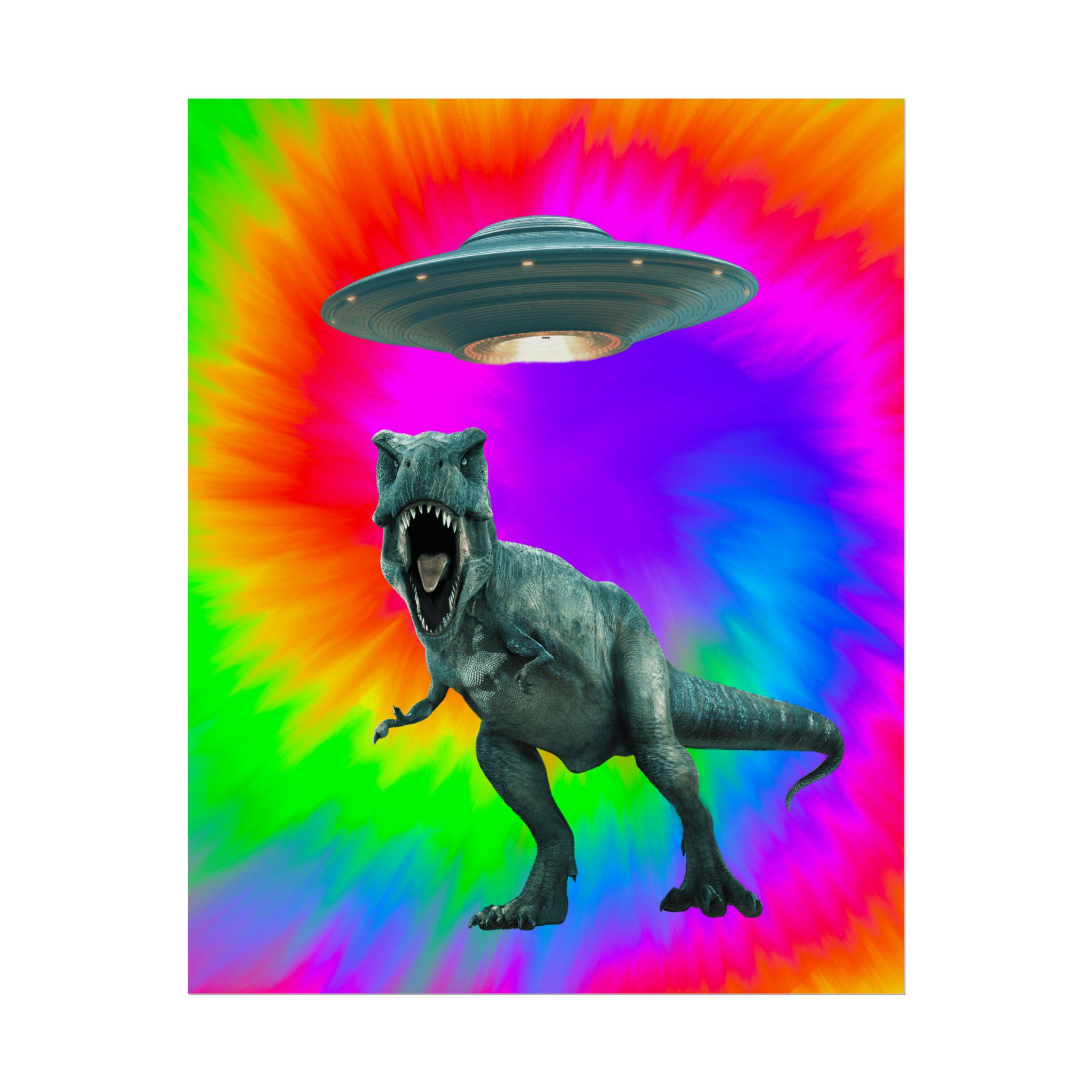 Transform your space with these vibrant rolled posters, perfect for adding a splash of color and a touch of fun to any room. Featuring a whimsical design of a roaring dinosaur beneath a flying saucer on a vibrant tie-dye background, these posters evoke a playful and adventurous vibe. Ideal for anyone who loves quirky art, this product fits seamlessly into a bedroom, dorm, or creative workspace, making it an excellent choice for decorating kids' rooms or personalizing your home office.