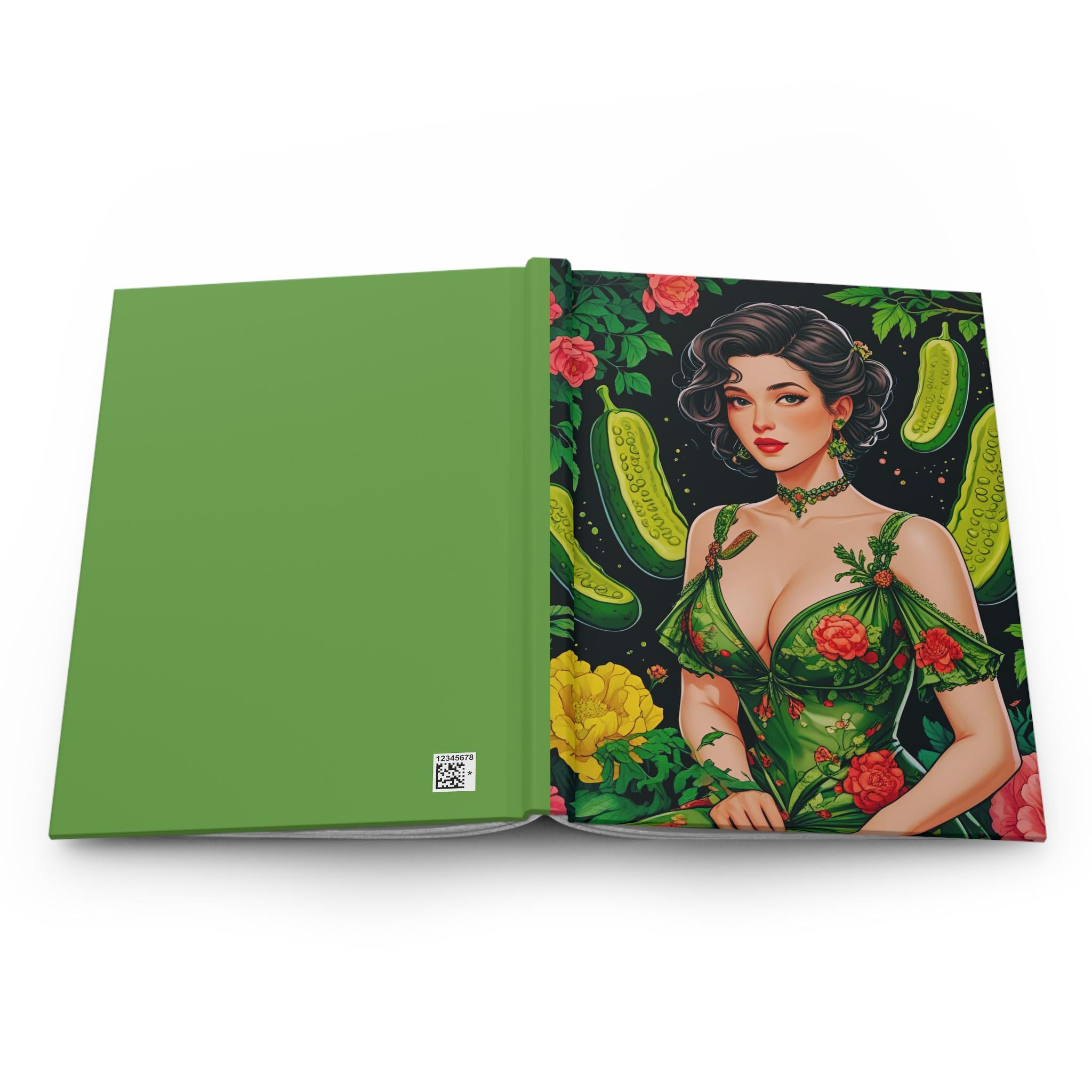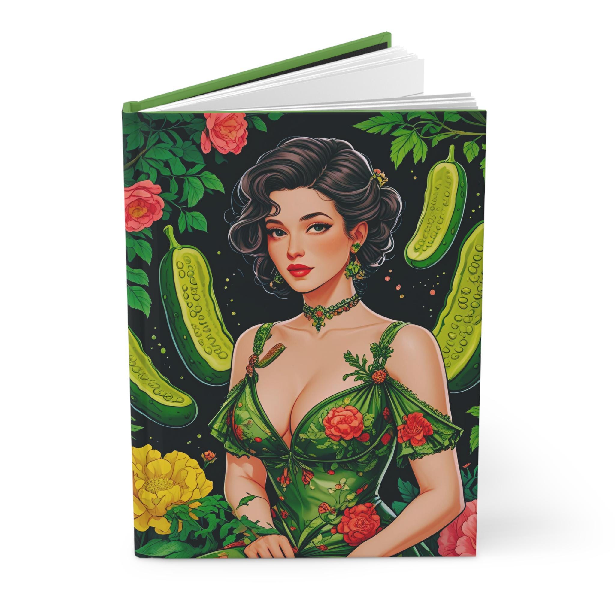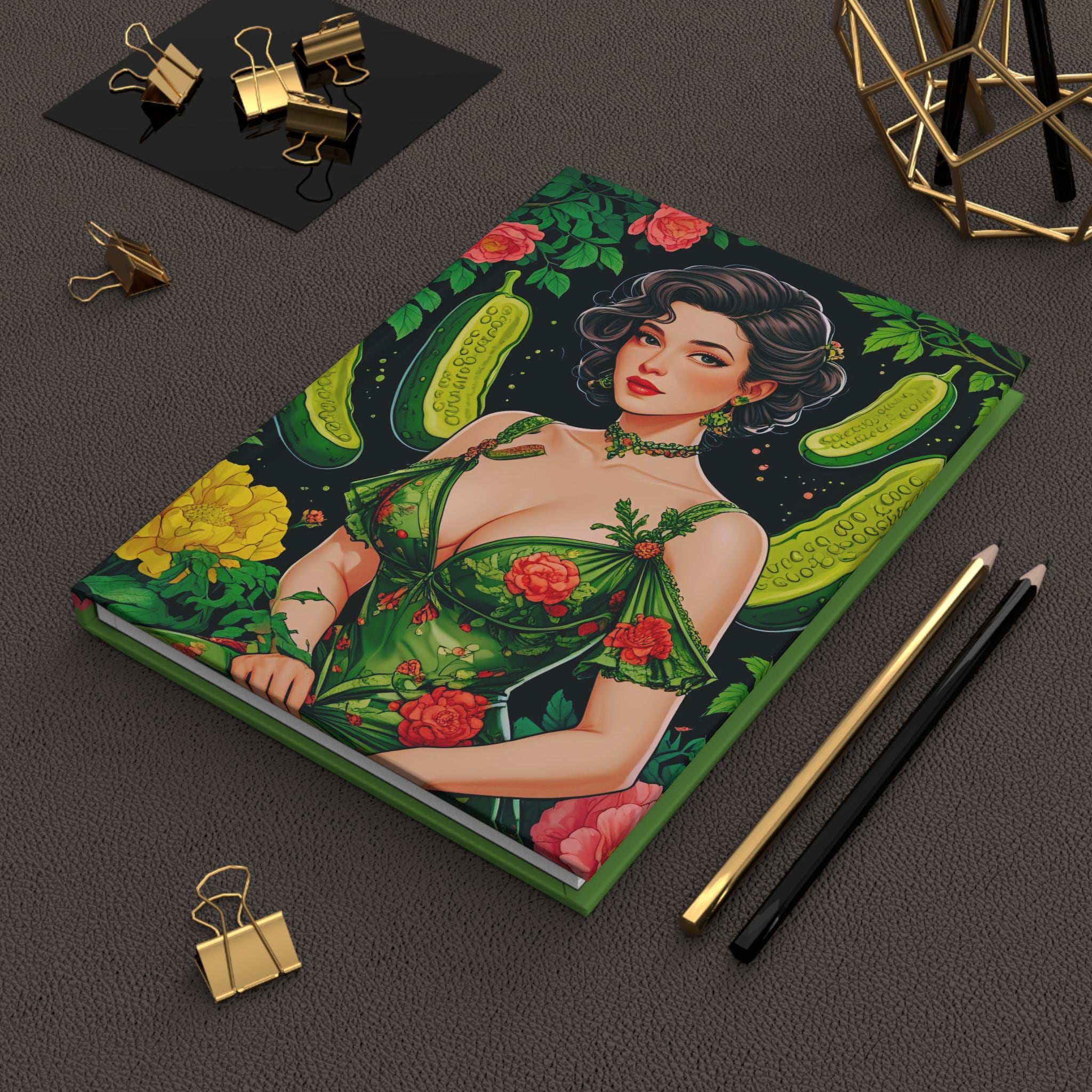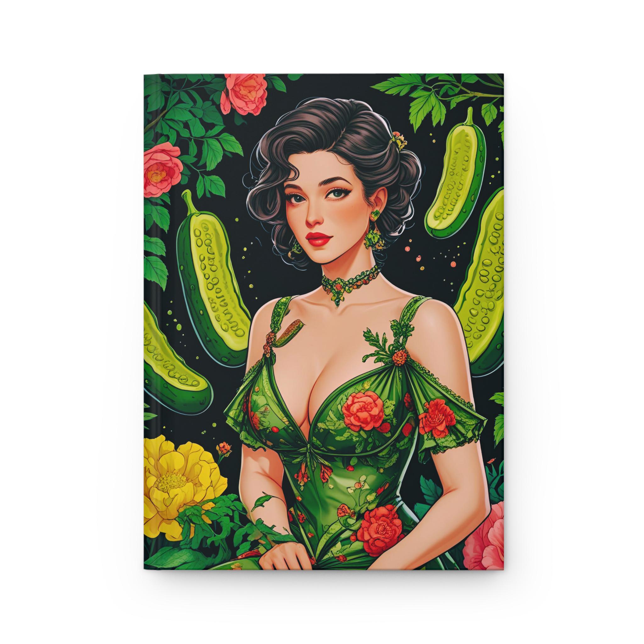 Vintage pickle coquette journal with a matte laminated cover and vibrant colors. Perfect for those who appreciate quirky and nostalgic designs. Ideal for writers, artists, and dreamers. Relevant for birthdays, holidays, and special occasions.