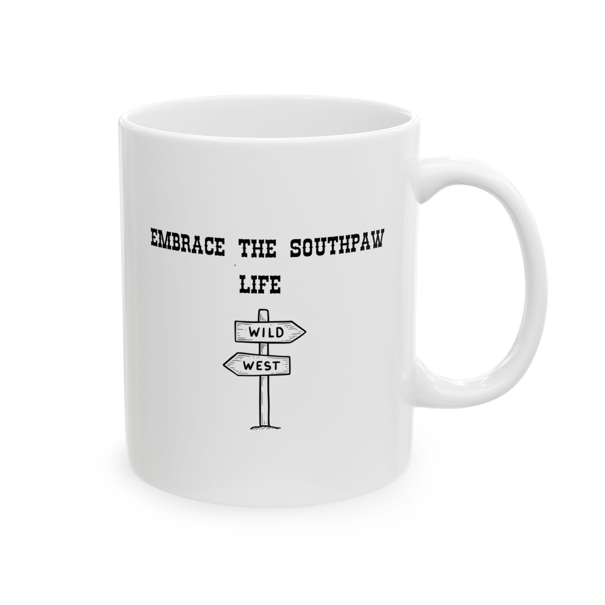 A cowboy southpaw themed mug designed for left-handed individuals. This mug provides a rustic, Western vibe, perfect for those who appreciate unique designs. Ideal for coffee or tea lovers who enjoy a touch of whimsy in their daily routine. Great for gifting during birthdays, Father's Day, or any celebration for a left-handed friend or family member.