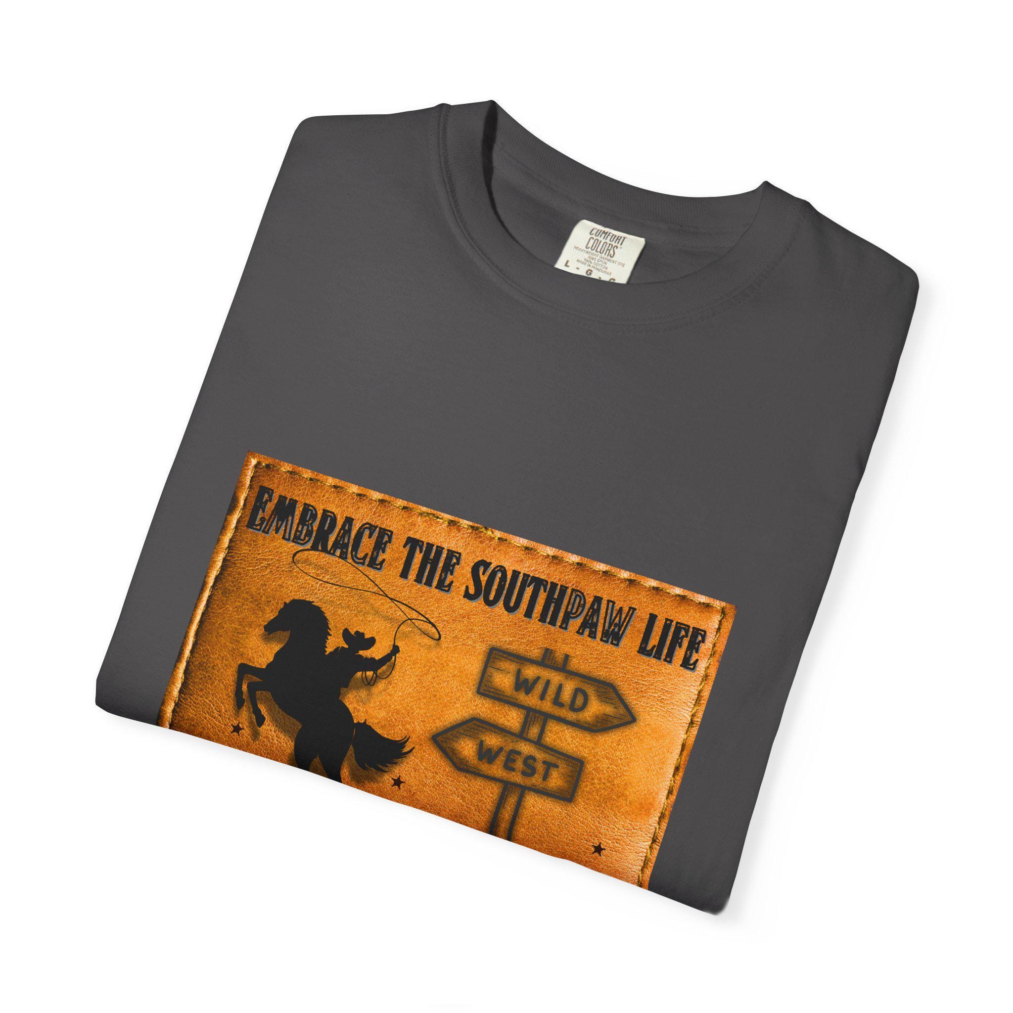 A comfortable unisex T-shirt featuring a unique left handed cowboy design. Perfect for those looking for a relaxed fit in both casual and semi-formal settings. The garment-dyed fabric gives it a soft color and texture, making it an ideal choice for those who appreciate quality and style. This T-shirt is relevant for adults and is perfect for gifting on birthdays, holidays, or casual wear.