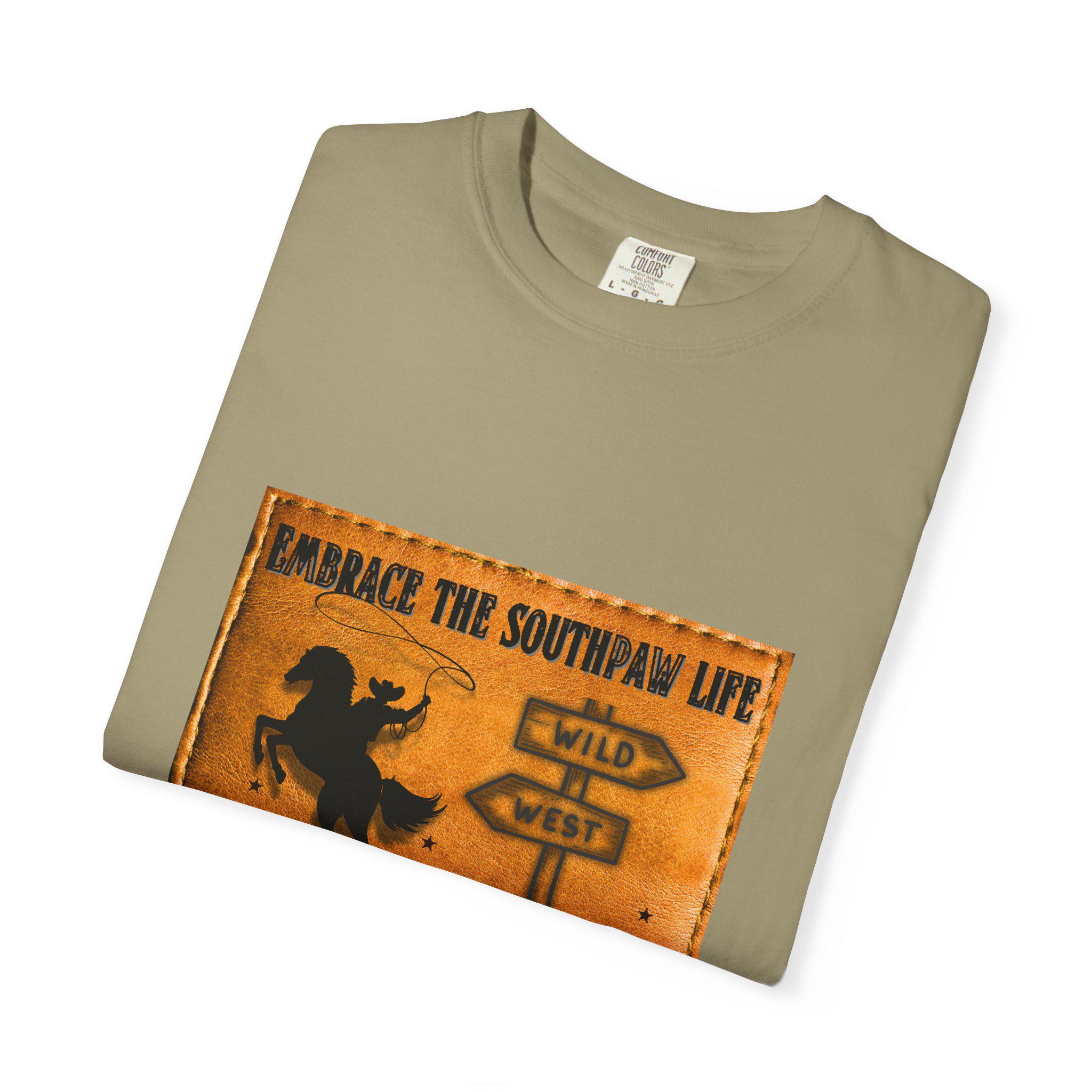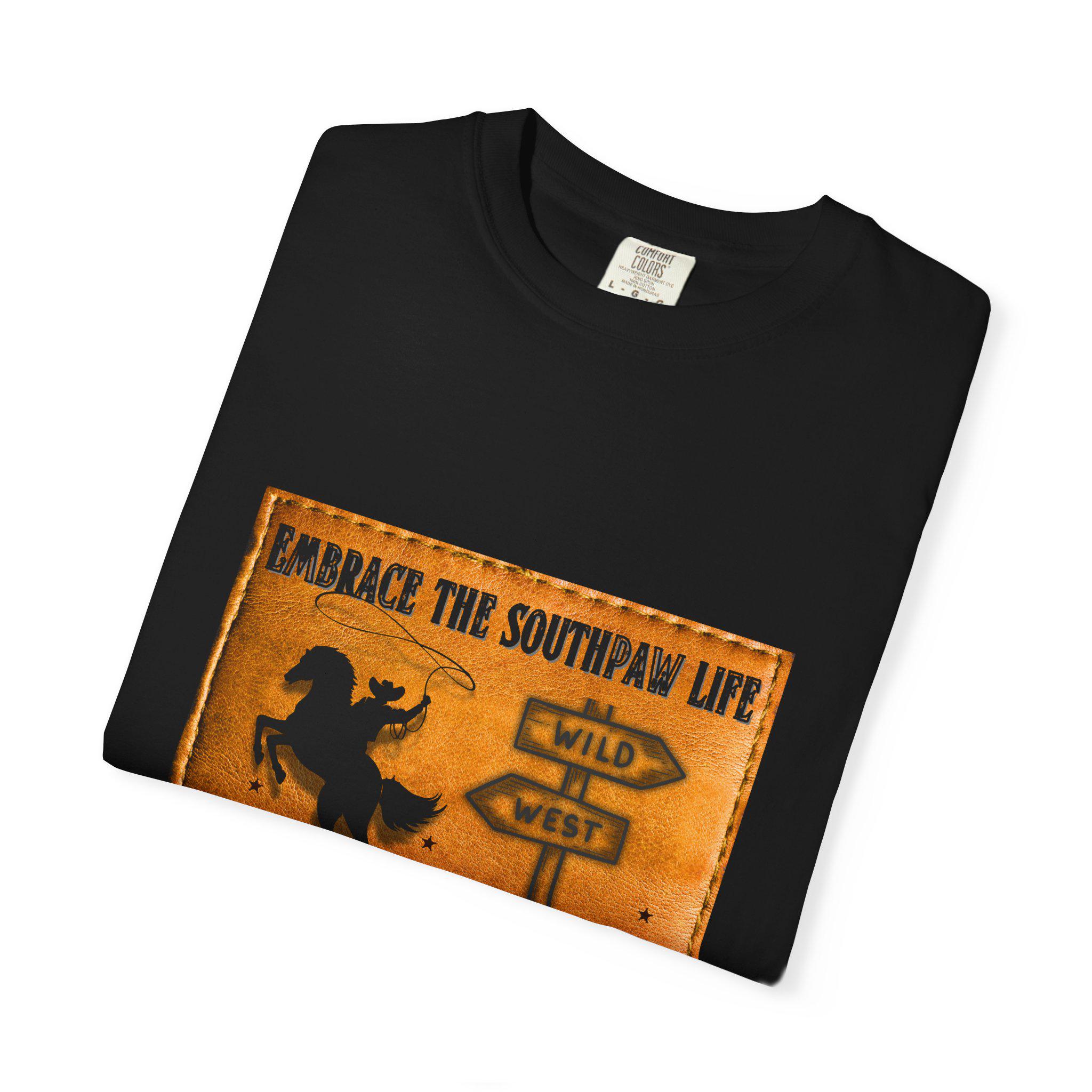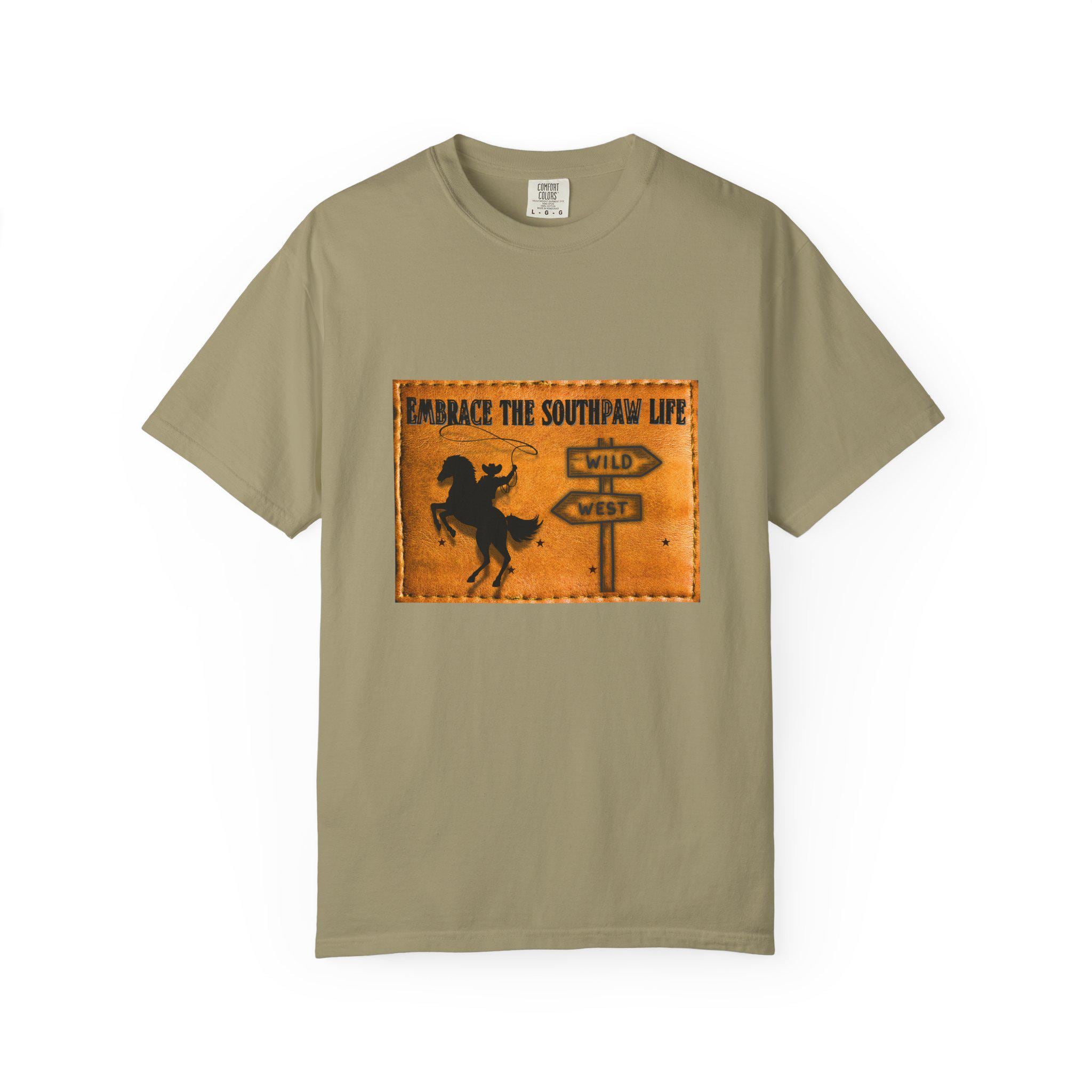 A comfortable unisex T-shirt featuring a unique left handed cowboy design. Perfect for those looking for a relaxed fit in both casual and semi-formal settings. The garment-dyed fabric gives it a soft color and texture, making it an ideal choice for those who appreciate quality and style. This T-shirt is relevant for adults and is perfect for gifting on birthdays, holidays, or casual wear.