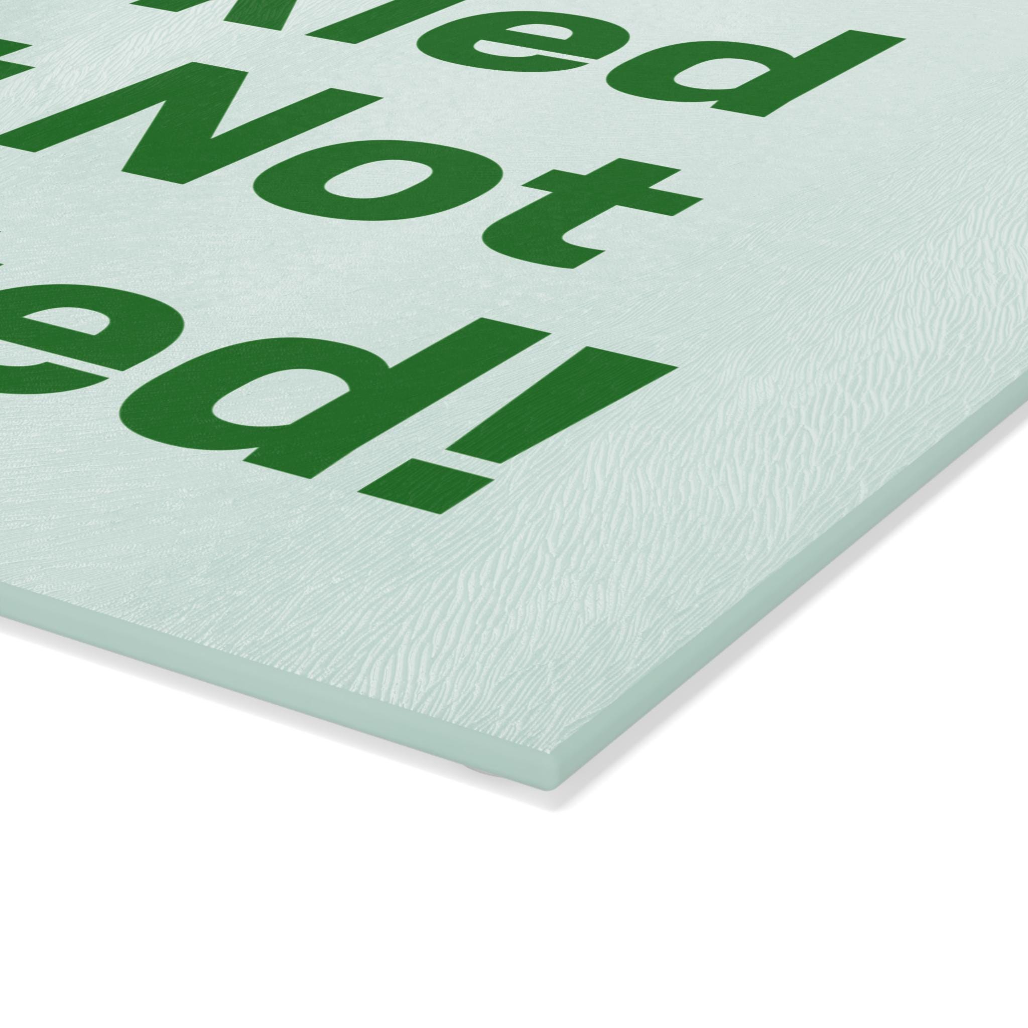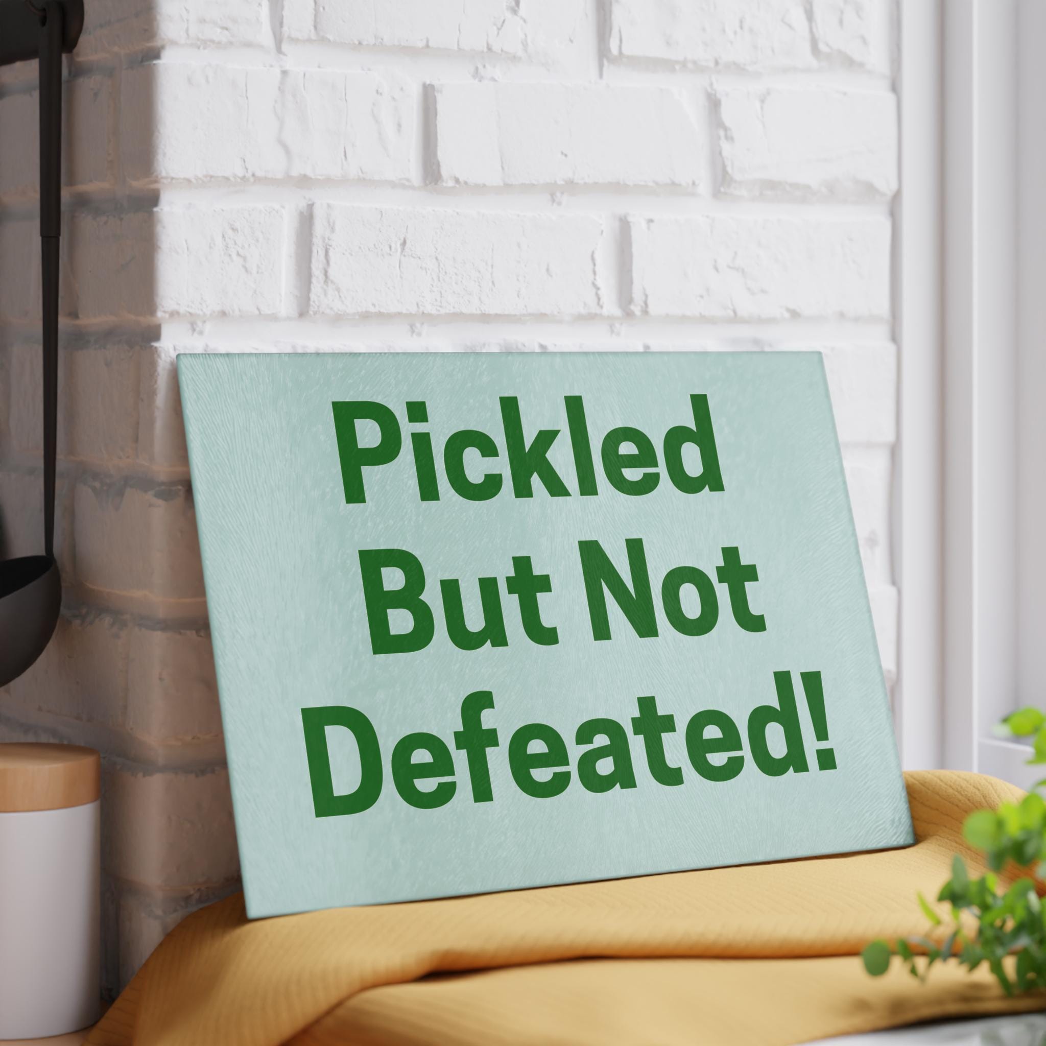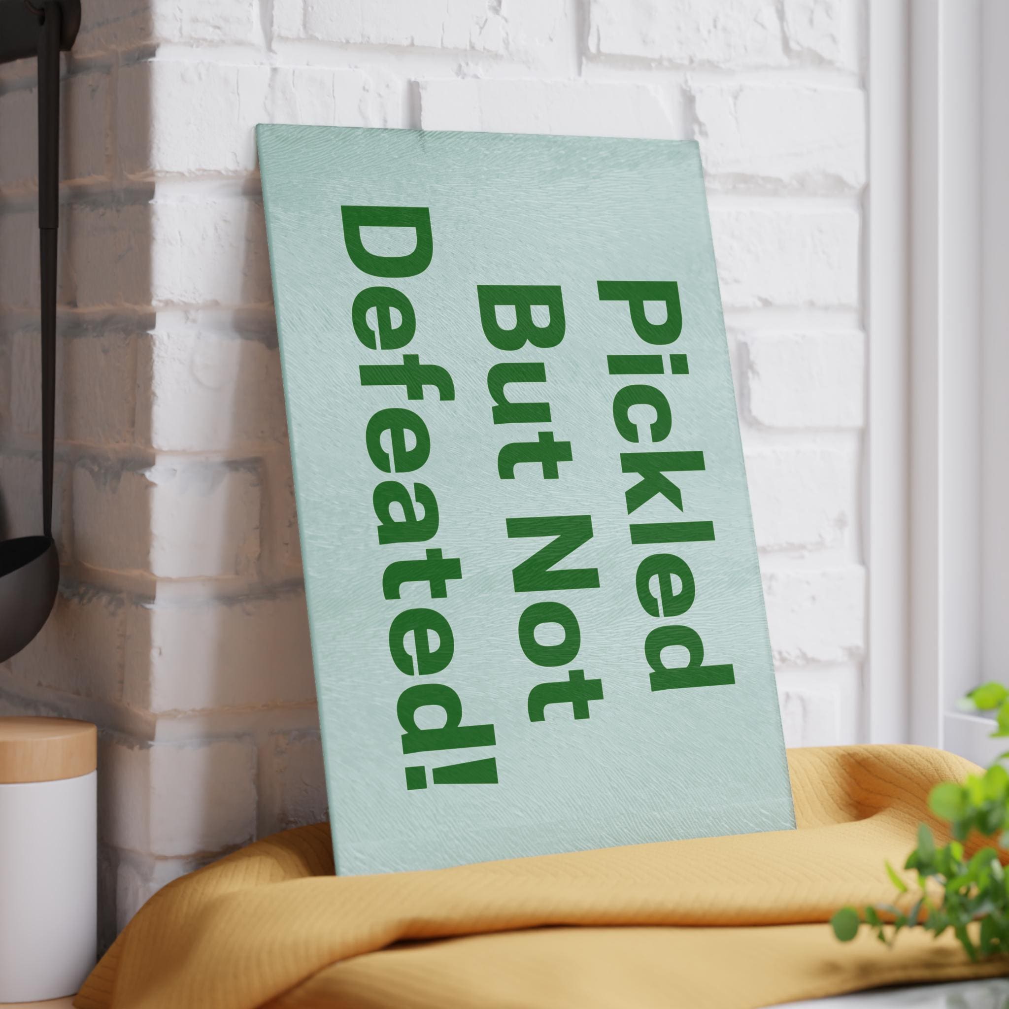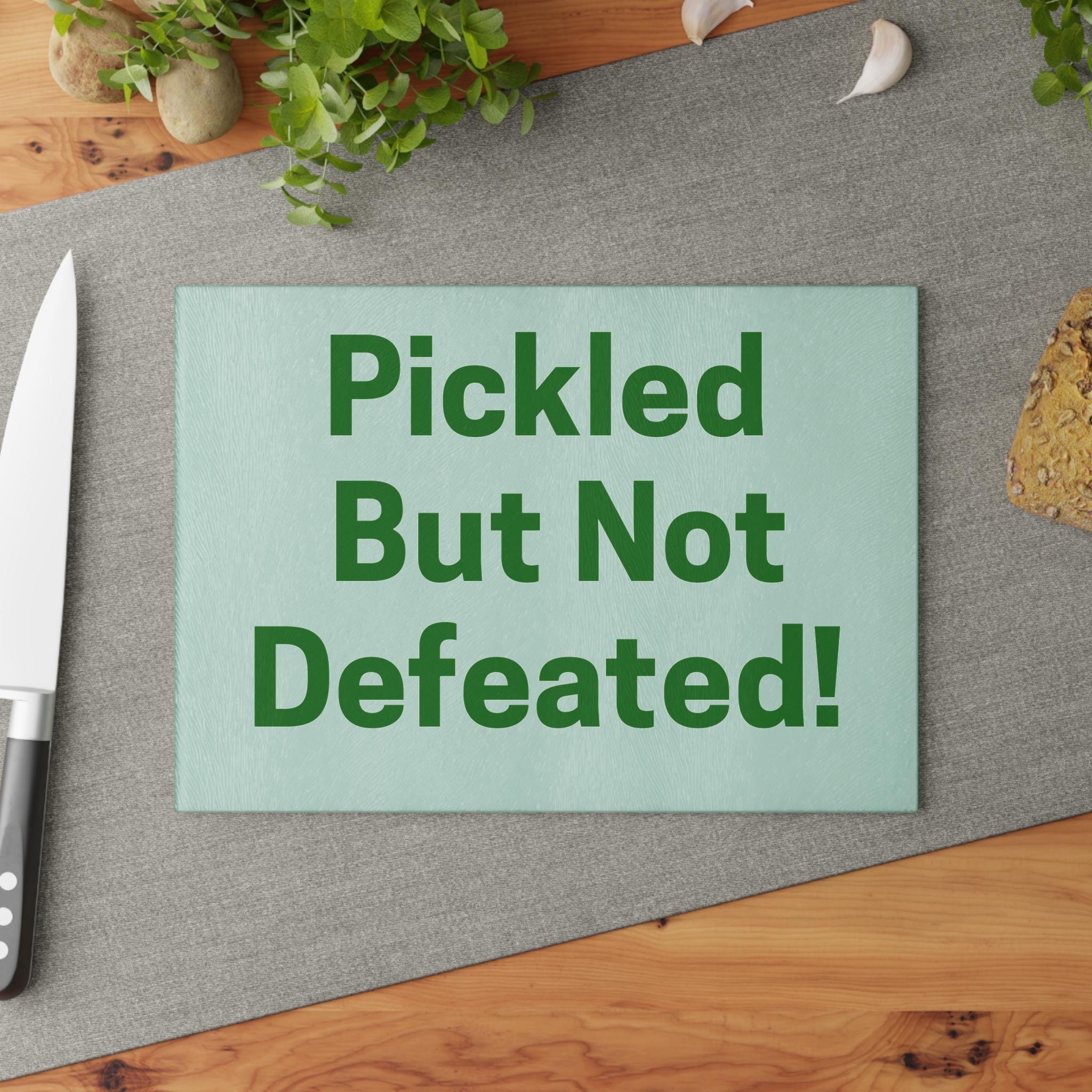 A cheerful tempered glass cutting board that brings a lighthearted, kitchen-ready attitude to everyday prep. The smooth, textured surface is printed with bold, playful lettering on a soft mint backdrop so the design reads like a wink every time you reach for it. Durable printing resists scratching from regular use, while the tempered glass keeps the surface sanitary and easy to wipe clean. Four rubber feet hold the board steady on counters, and two compact sizes fit busy countertops or small apartment kitchens. Recommended for hand wash to preserve the vivid colors and finish.