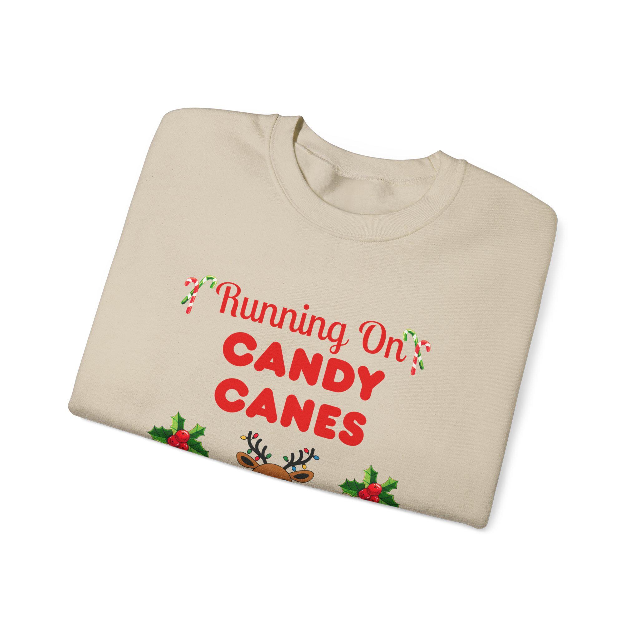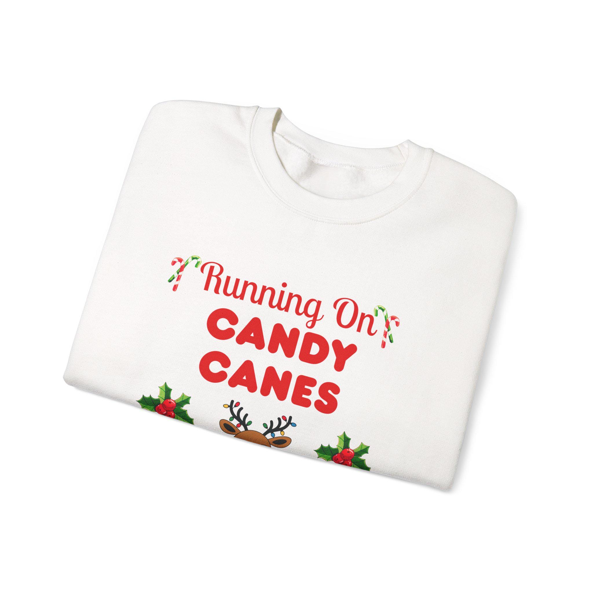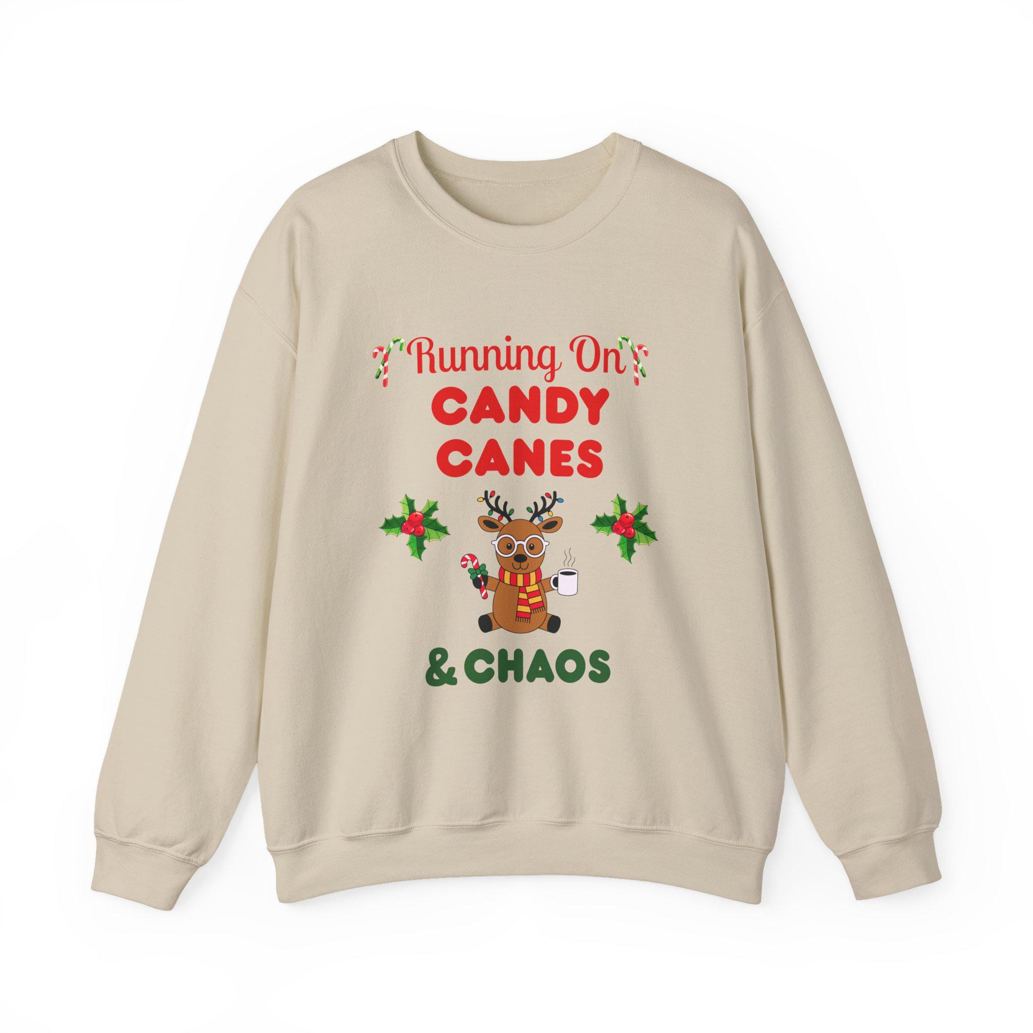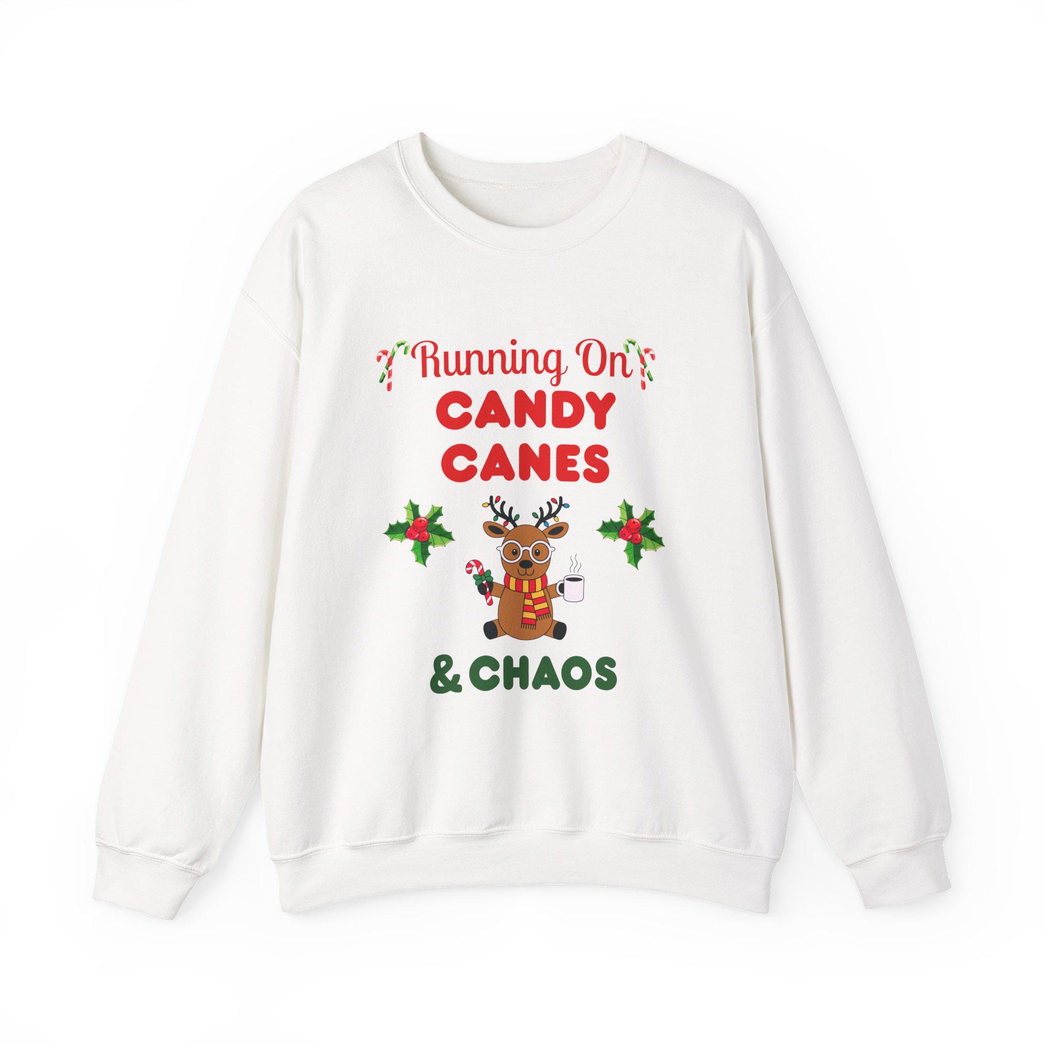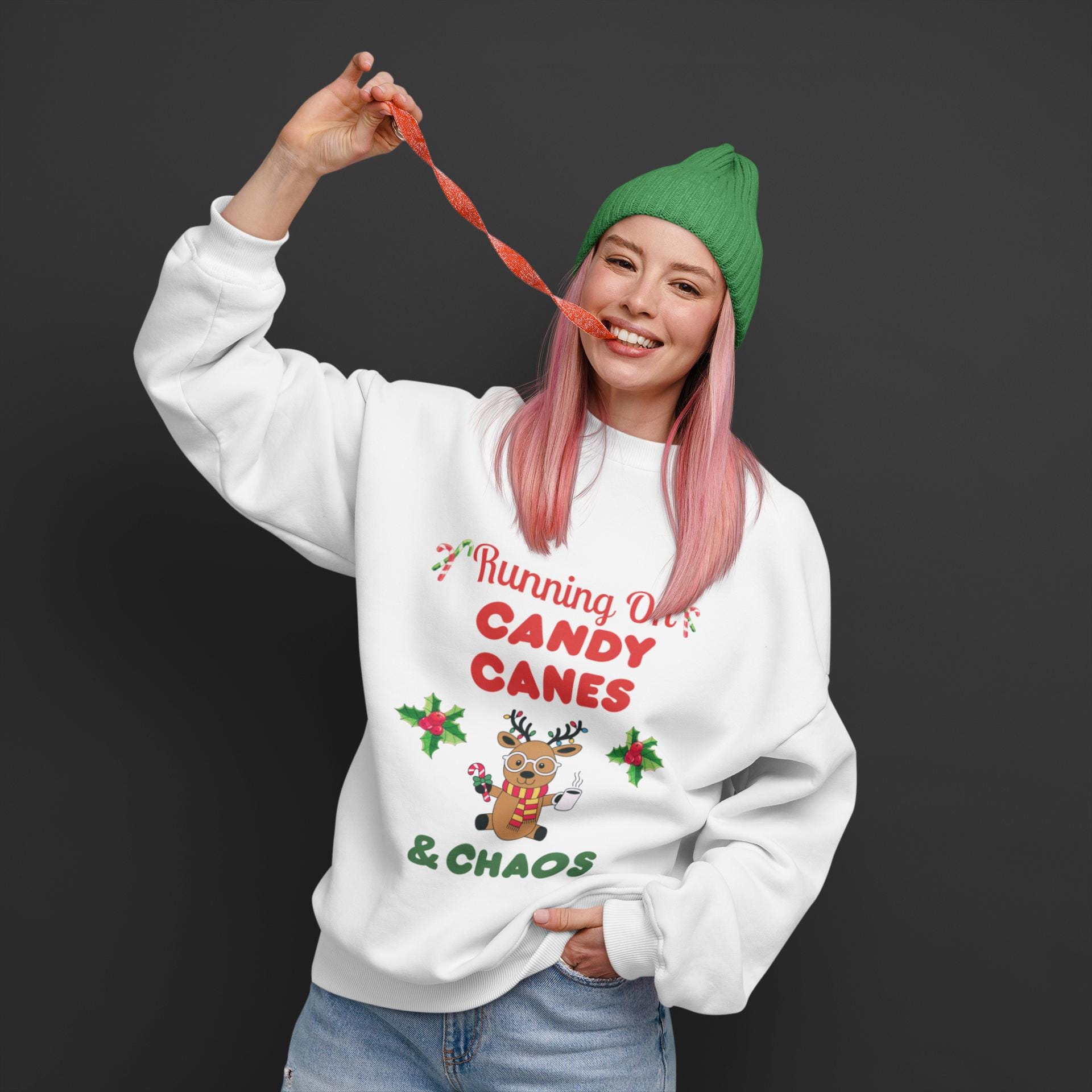 Soft, cozy, and slightly mischievous — this crewneck wraps holiday energy into a wearable inside joke. The white sweatshirt features playful red-and-green artwork: a cheerful reindeer holding a candy cane and coffee, flanked by holly accents, with the words “Running On Candy Canes & Chaos.” It reads like a laugh shared over crowded kitchens and late-night wrapping sessions. Built with a midweight cotton-poly blend and a classic crew cut, it layers well over tees or under coats, and the durable stitching keeps it feeling lived-in wash after wash. The print and optional embroidery placements give it a handcrafted touch that fits into festive family gatherings, chaotic cookie-baking marathons, and relaxed winter mornings with a mug in hand.