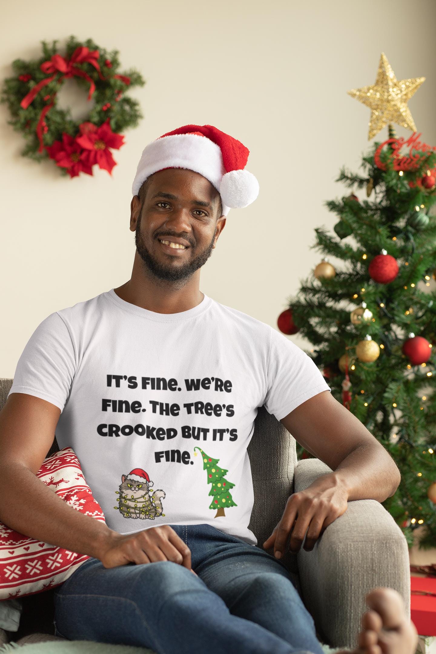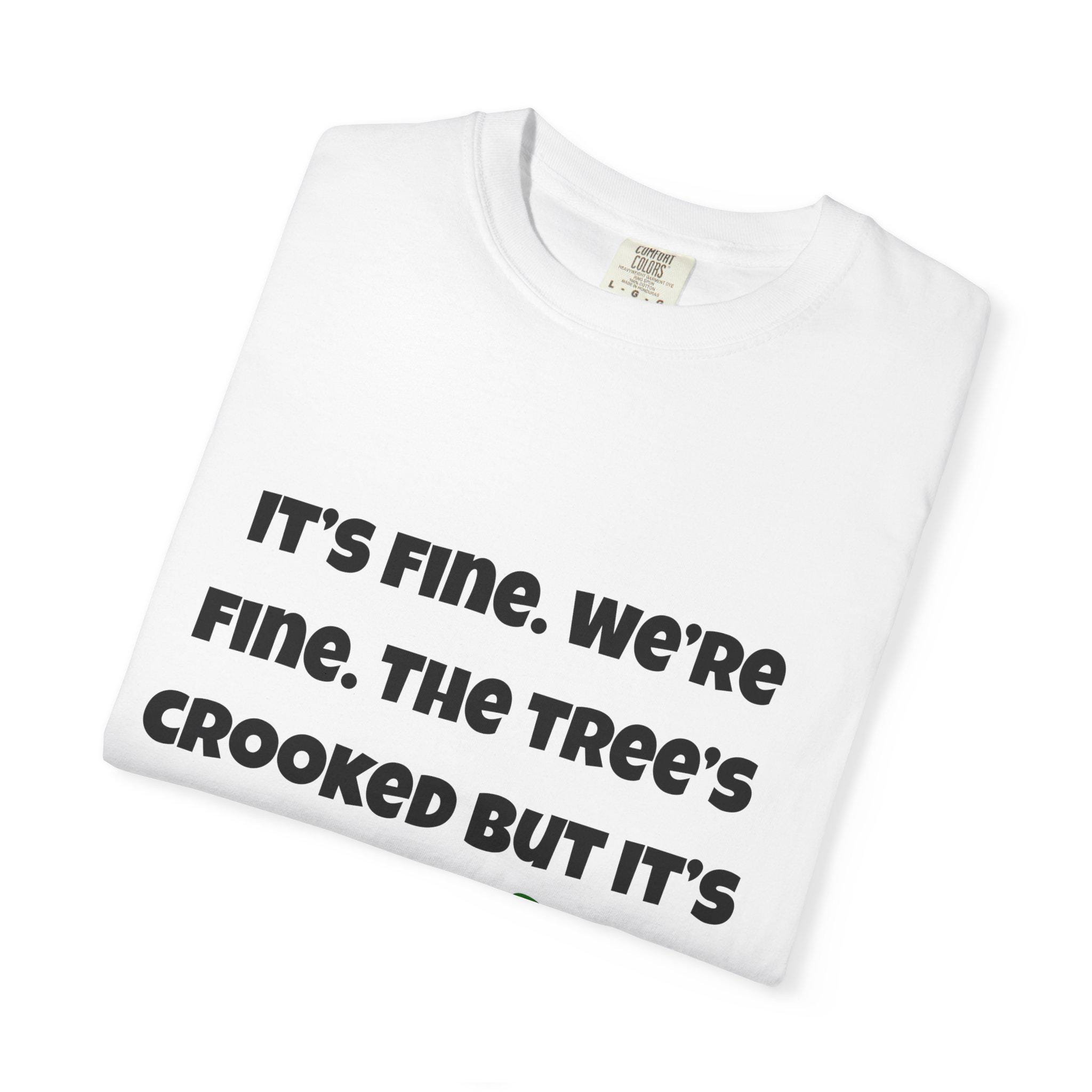 This relaxed-fit garment-dyed tee brings a warm, lived-in feel to holiday moments with a touch of dry humor. The front shows a small, cozy scene — a frazzled, blanket-wrapped character beside a slightly crooked Christmas tree and the cheeky line, “It’s fine. We’re fine. The tree’s crooked but it’s fine.” The cotton softens with each wash and dye cycle, so the color and print settle into the fabric like a memory. Wear it on laid-back evenings trimming the tree, at family movie nights, or during low-key gatherings where real life wins over perfection. The tone is affectionate and wry, the fit forgiving and familiar, and the look pairs easily with jeans, joggers, or cozy layers when the house gets loud and the tree leans a little to the side.