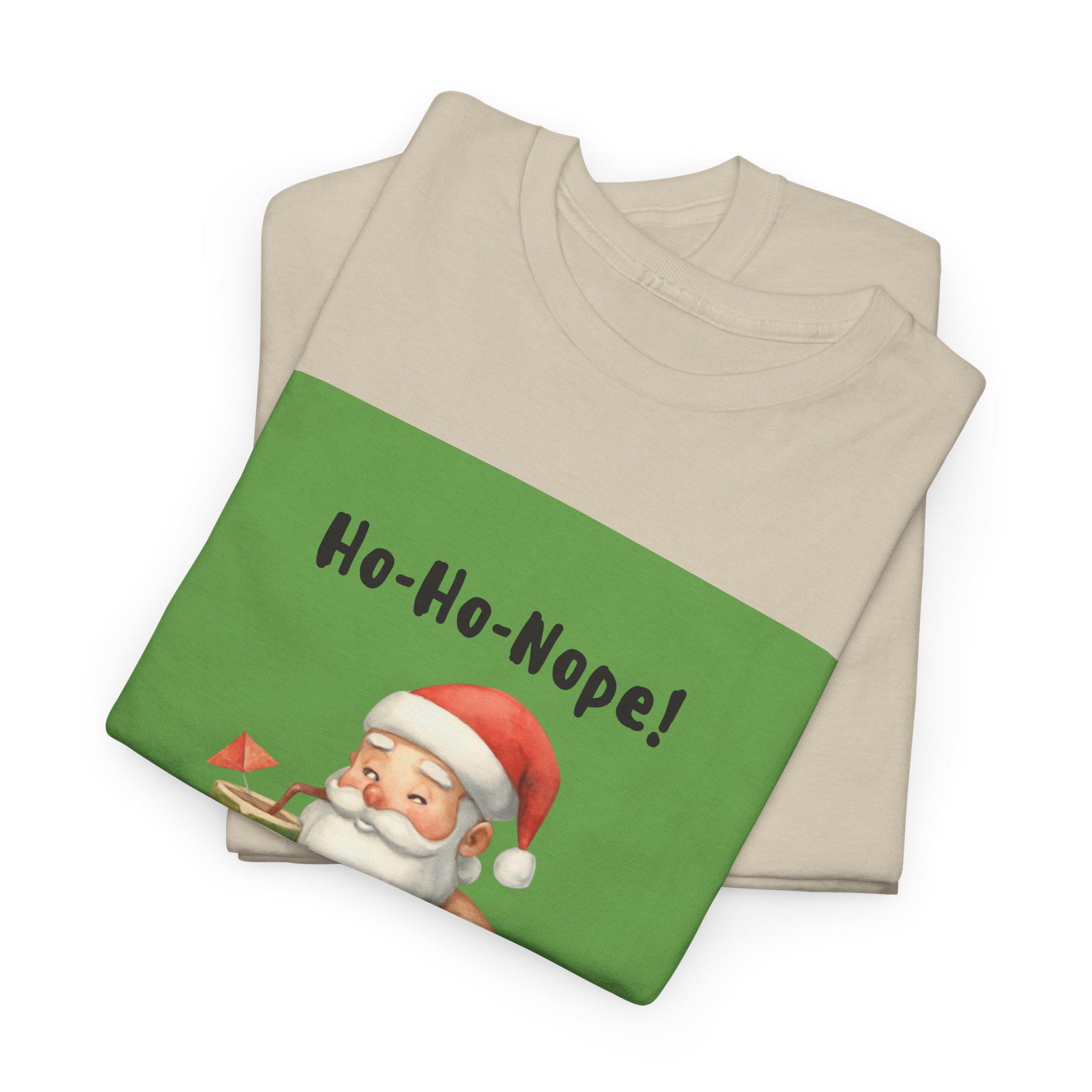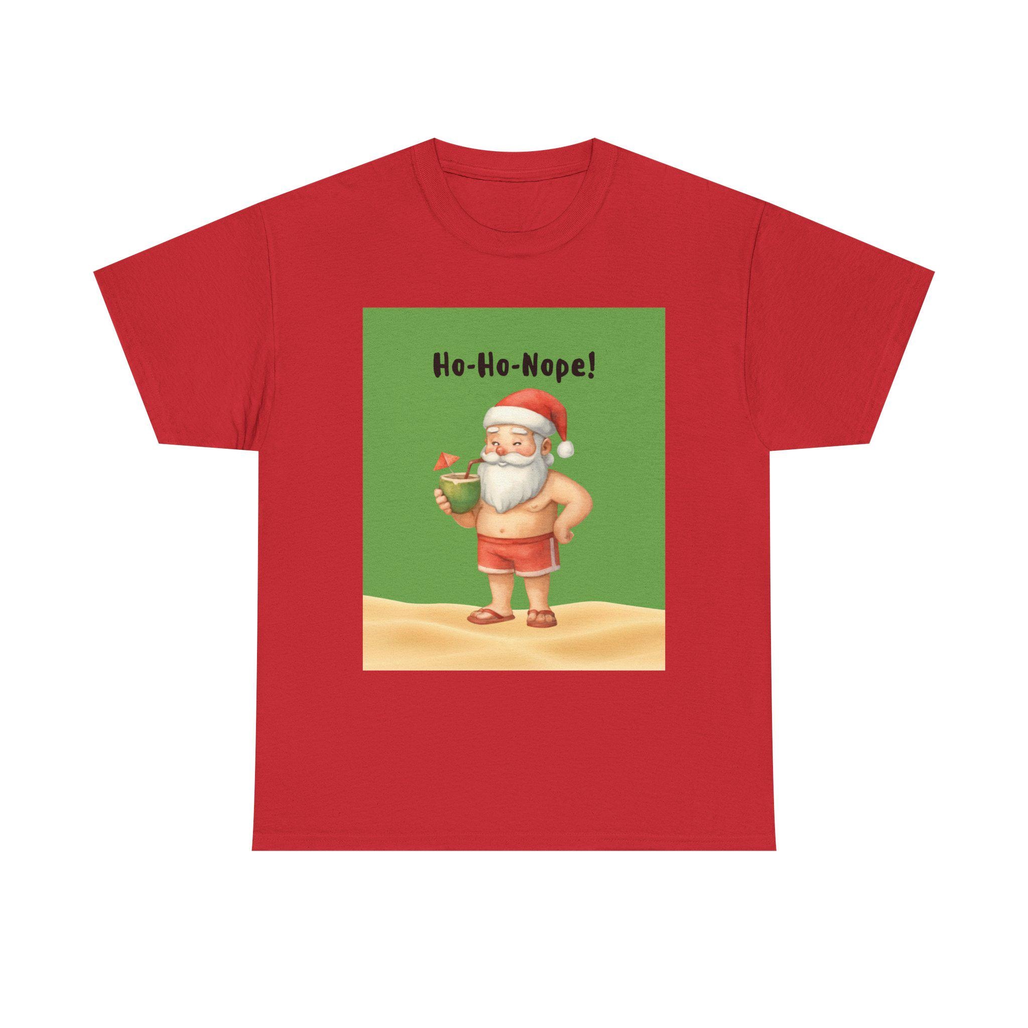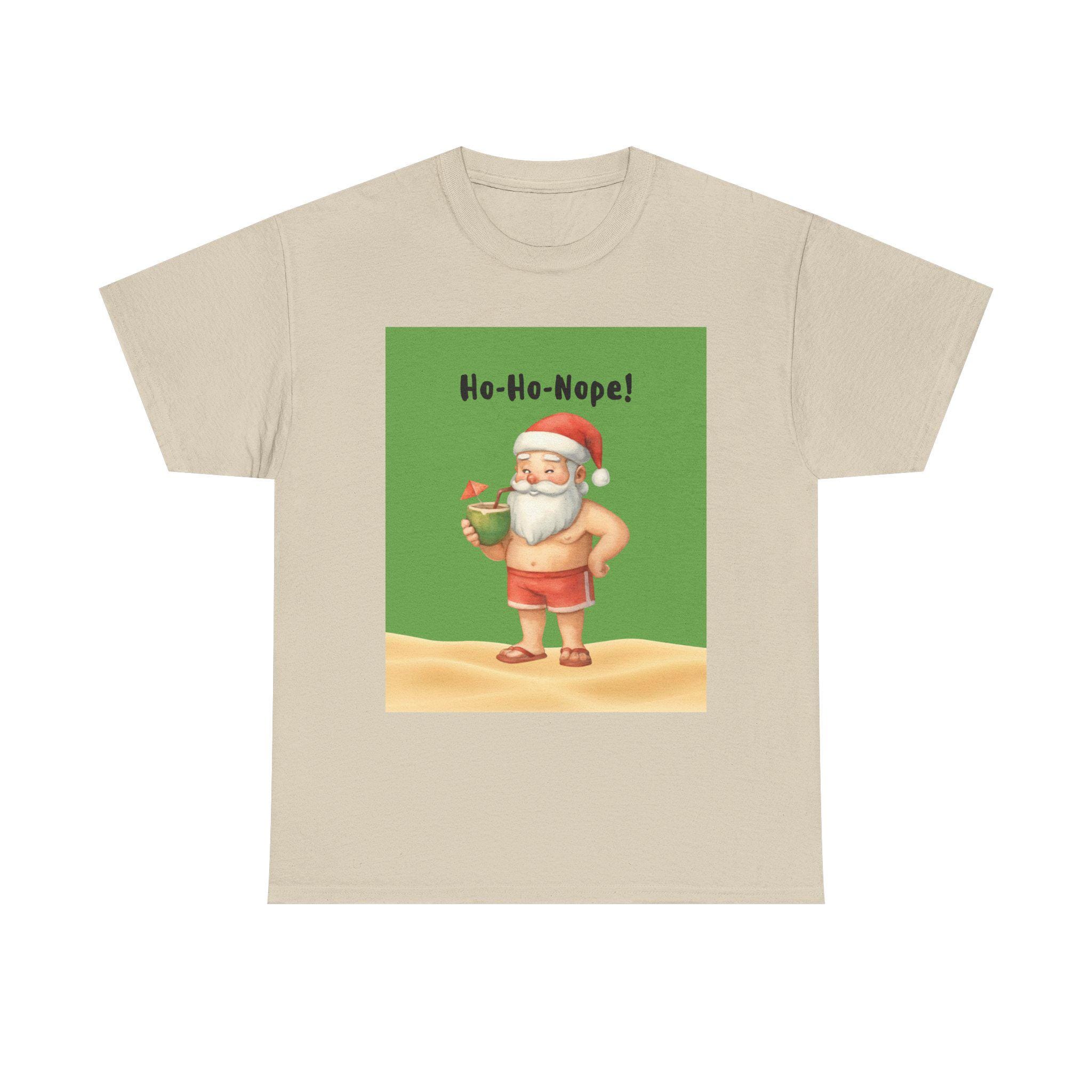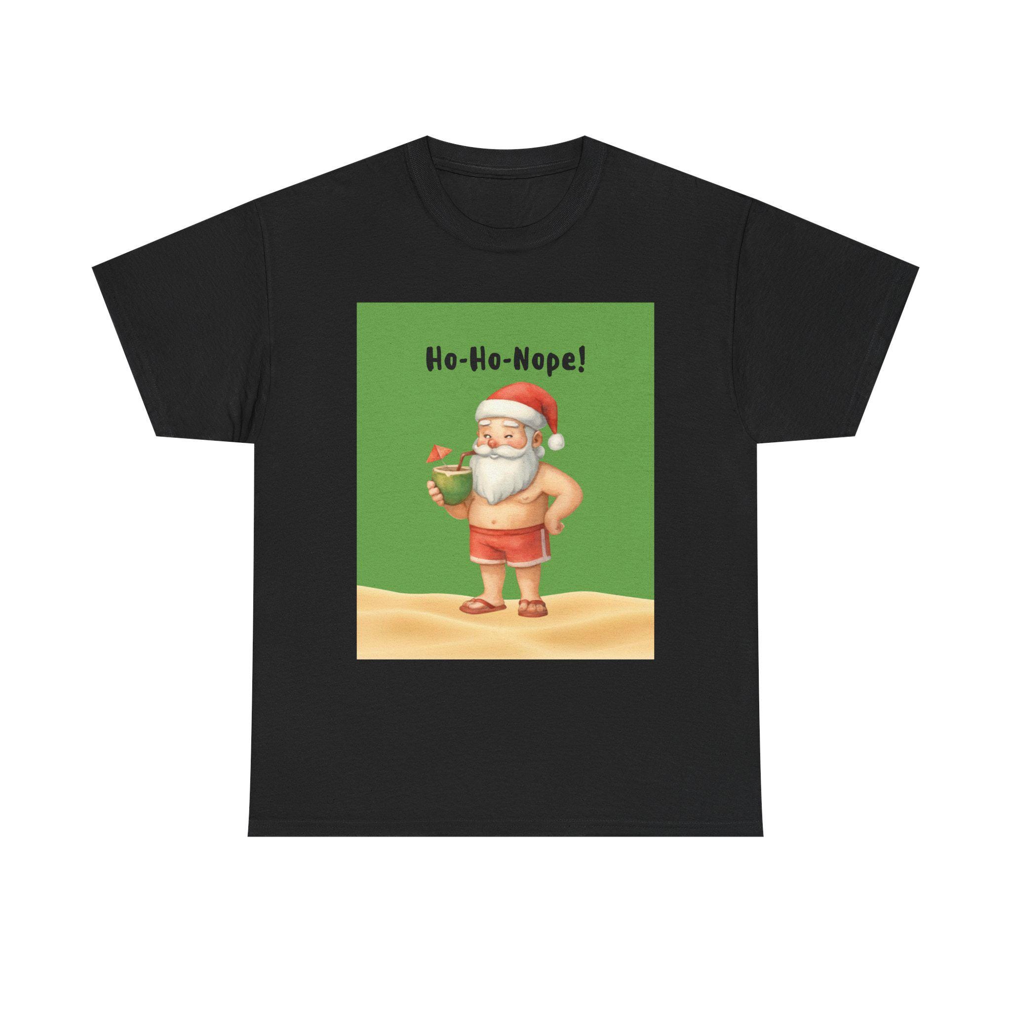 A soft, classic tee that brings summer vibes to holiday mischief. The design shows a laid-back Santa in shorts, raising a cocktail and cheekily declaring “Ho-Ho-Nope!” — a playful twist on festive traditions for those who’d rather be on the beach than shivering in the snow. Lightweight yet sturdy, this shirt wears like a favorite: relaxed at the shoulders, clean at the collar, and smooth across the print so the artwork stands out. It slips into everyday life — beneath a cardigan, over boardshorts, or solo at a backyard gathering — and speaks to anyone who wants their holiday humor sunny and effortless.