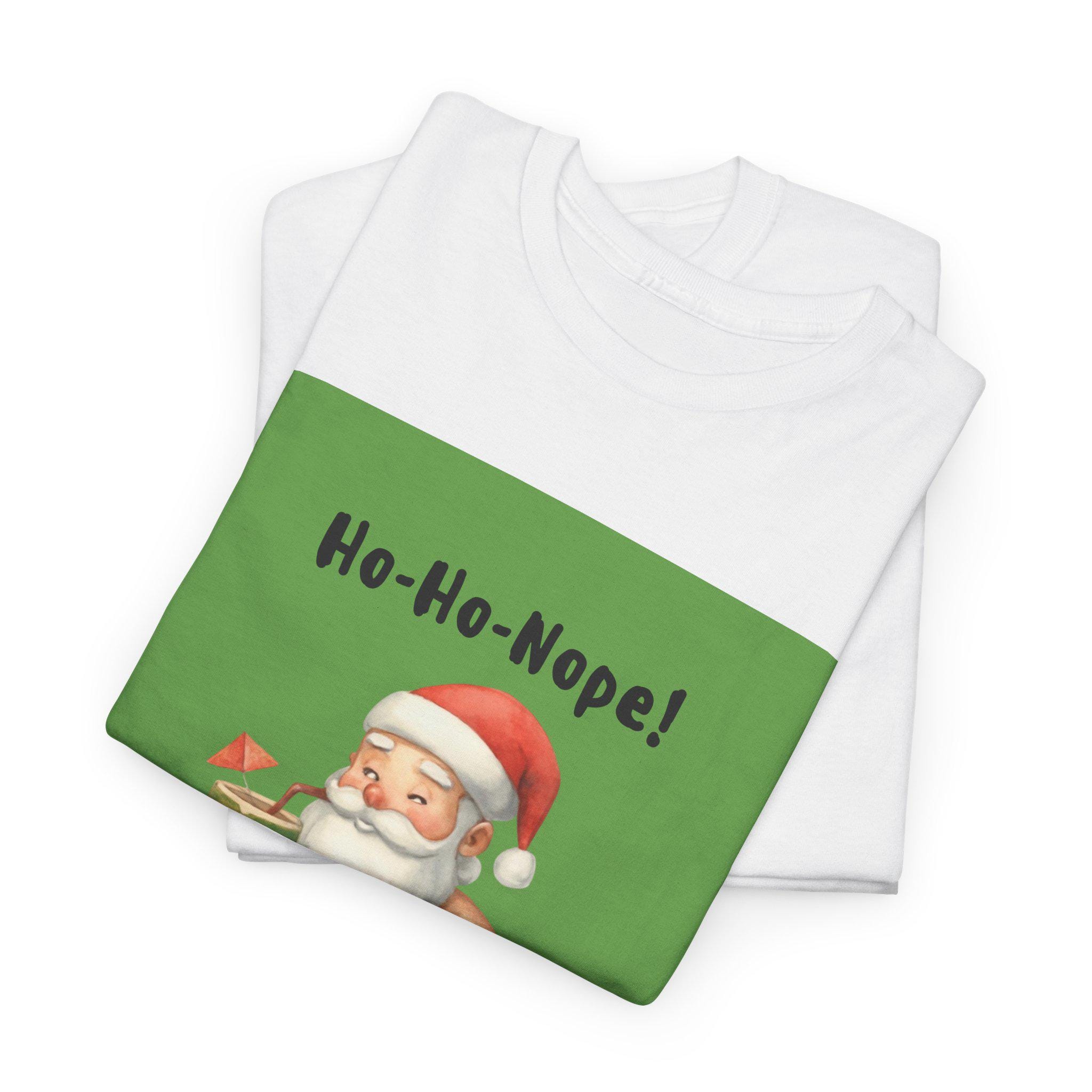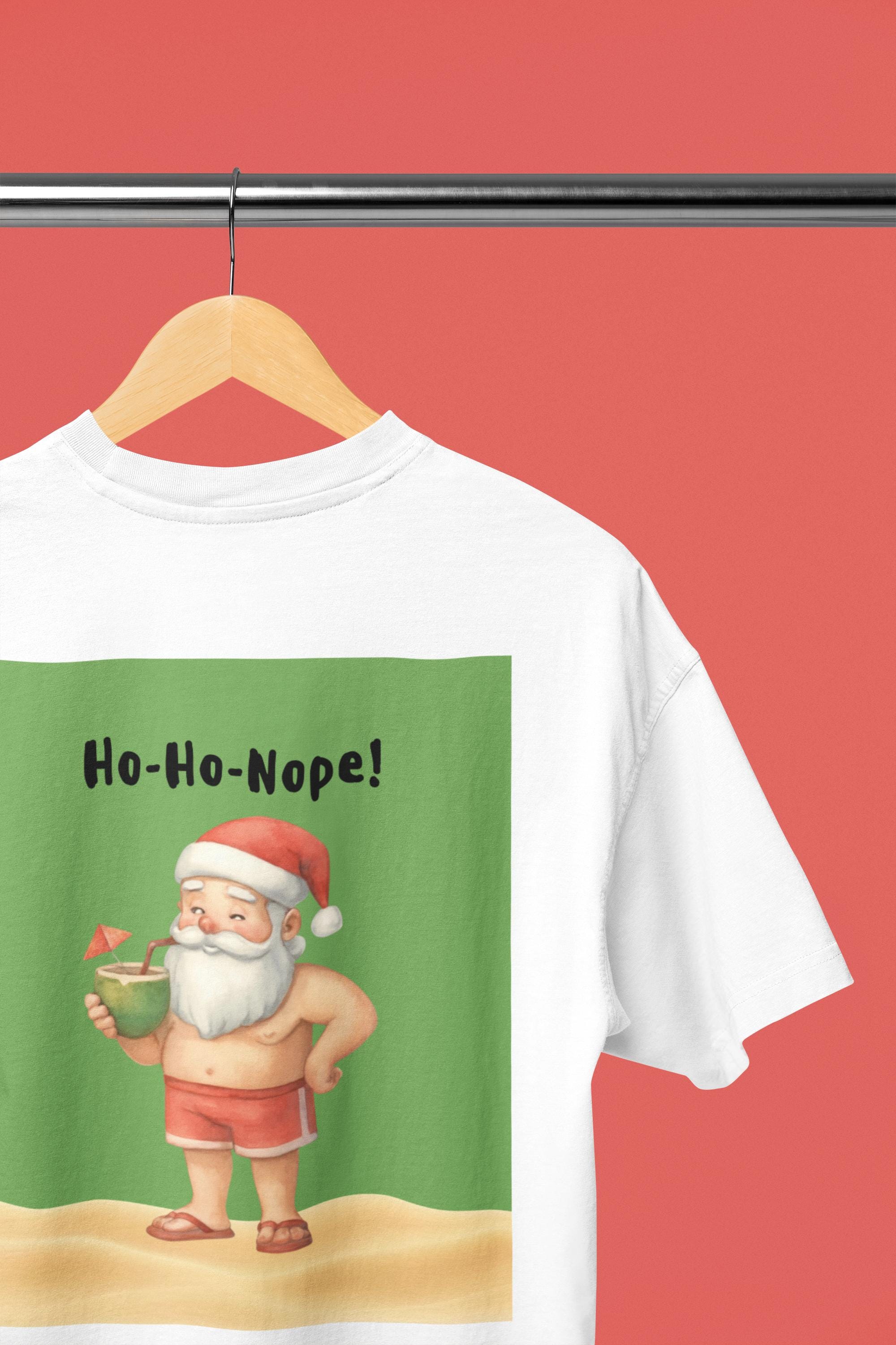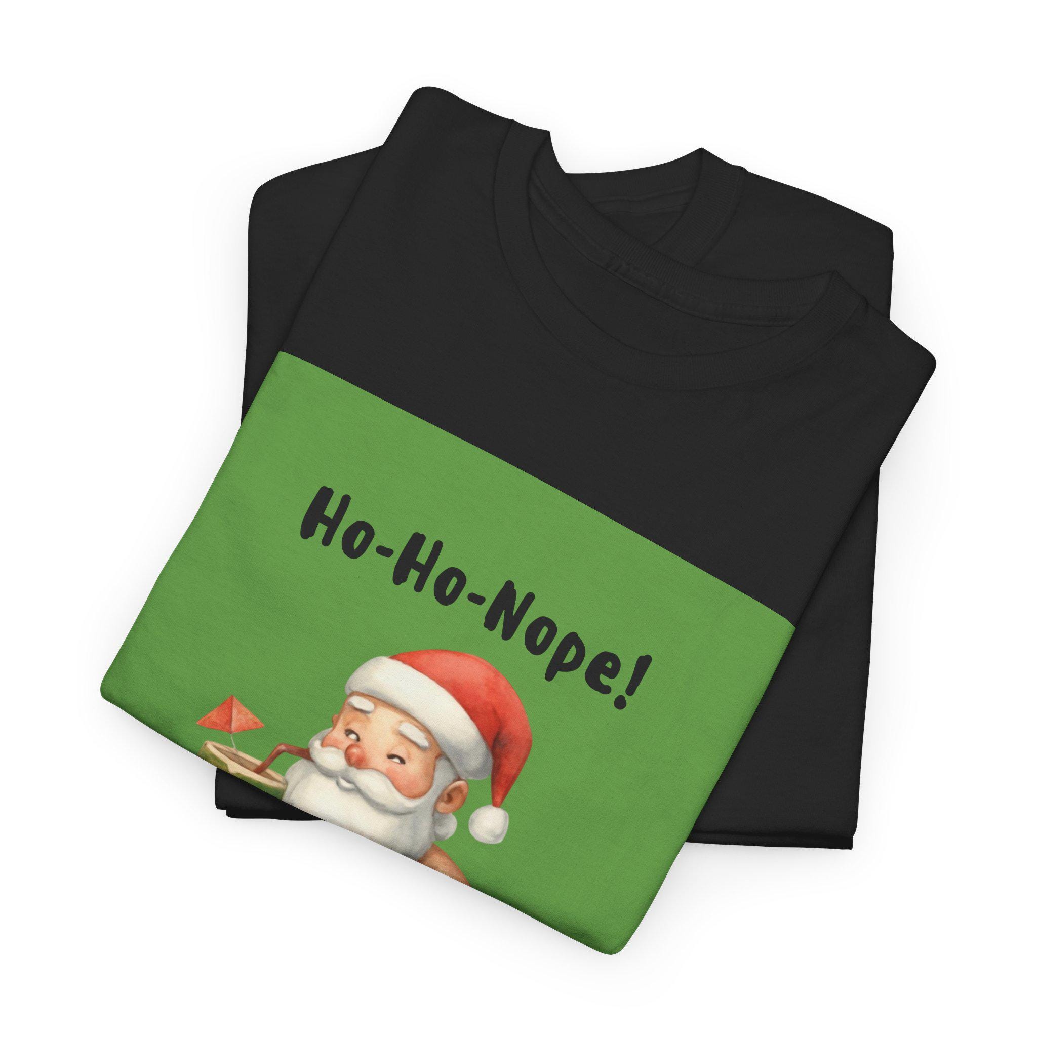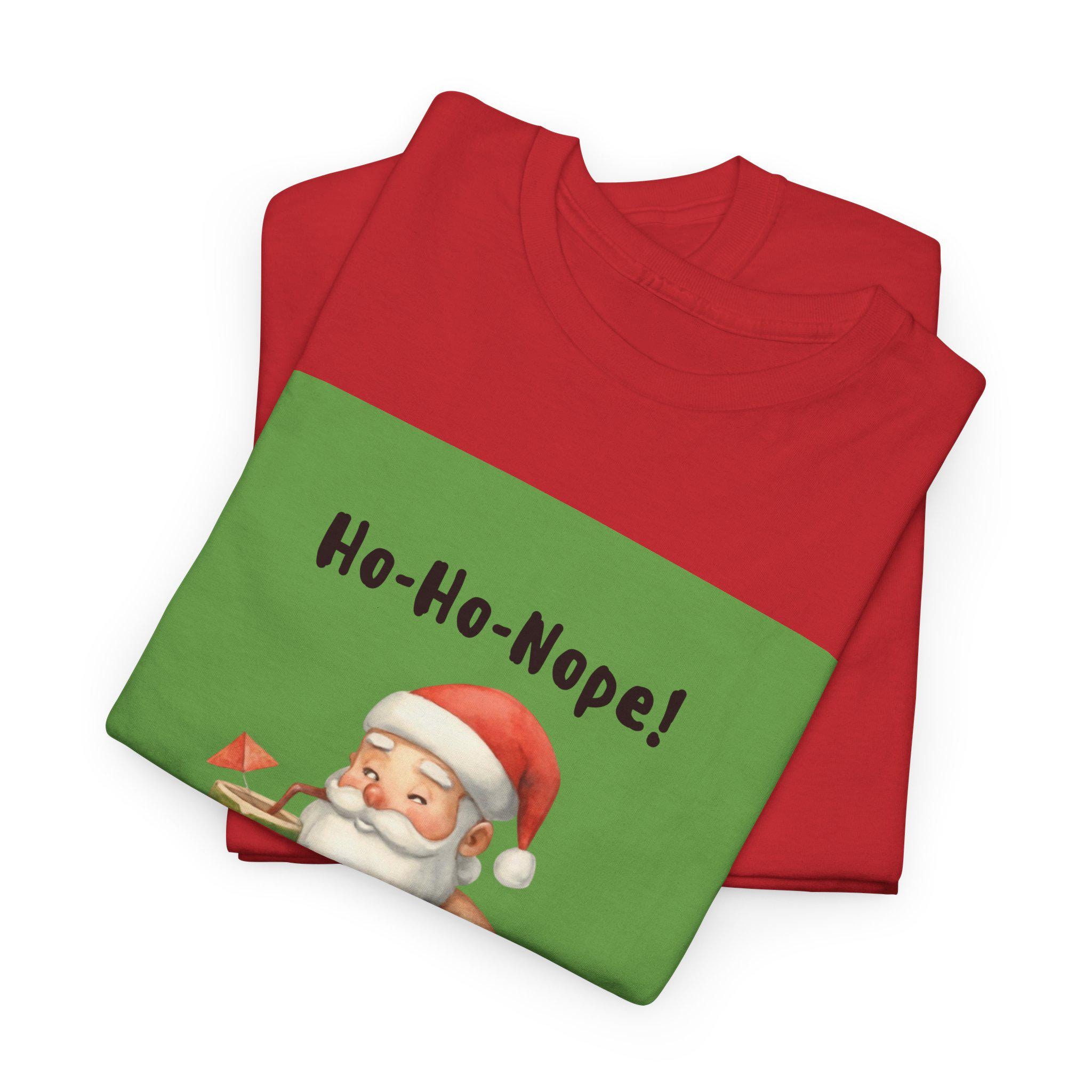 A soft, classic tee that brings summer vibes to holiday mischief. The design shows a laid-back Santa in shorts, raising a cocktail and cheekily declaring “Ho-Ho-Nope!” — a playful twist on festive traditions for those who’d rather be on the beach than shivering in the snow. Lightweight yet sturdy, this shirt wears like a favorite: relaxed at the shoulders, clean at the collar, and smooth across the print so the artwork stands out. It slips into everyday life — beneath a cardigan, over boardshorts, or solo at a backyard gathering — and speaks to anyone who wants their holiday humor sunny and effortless.