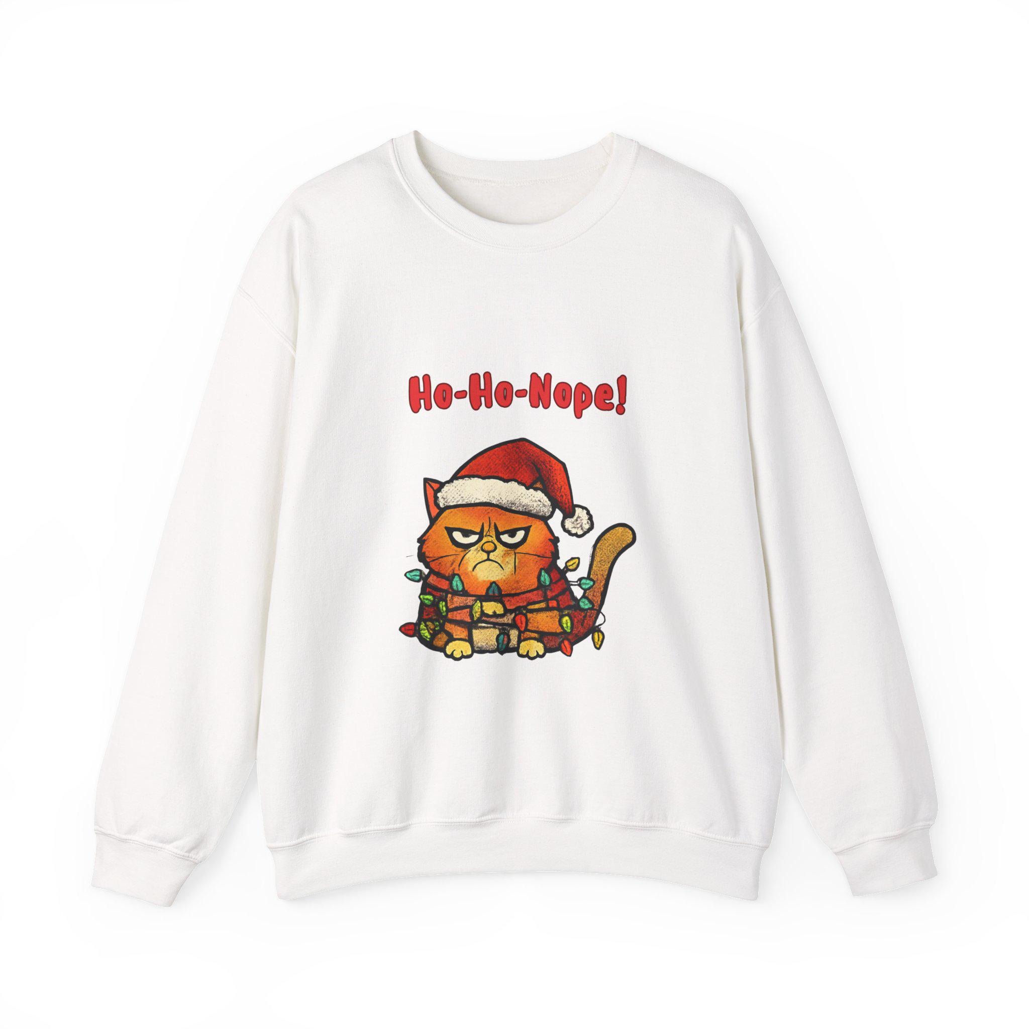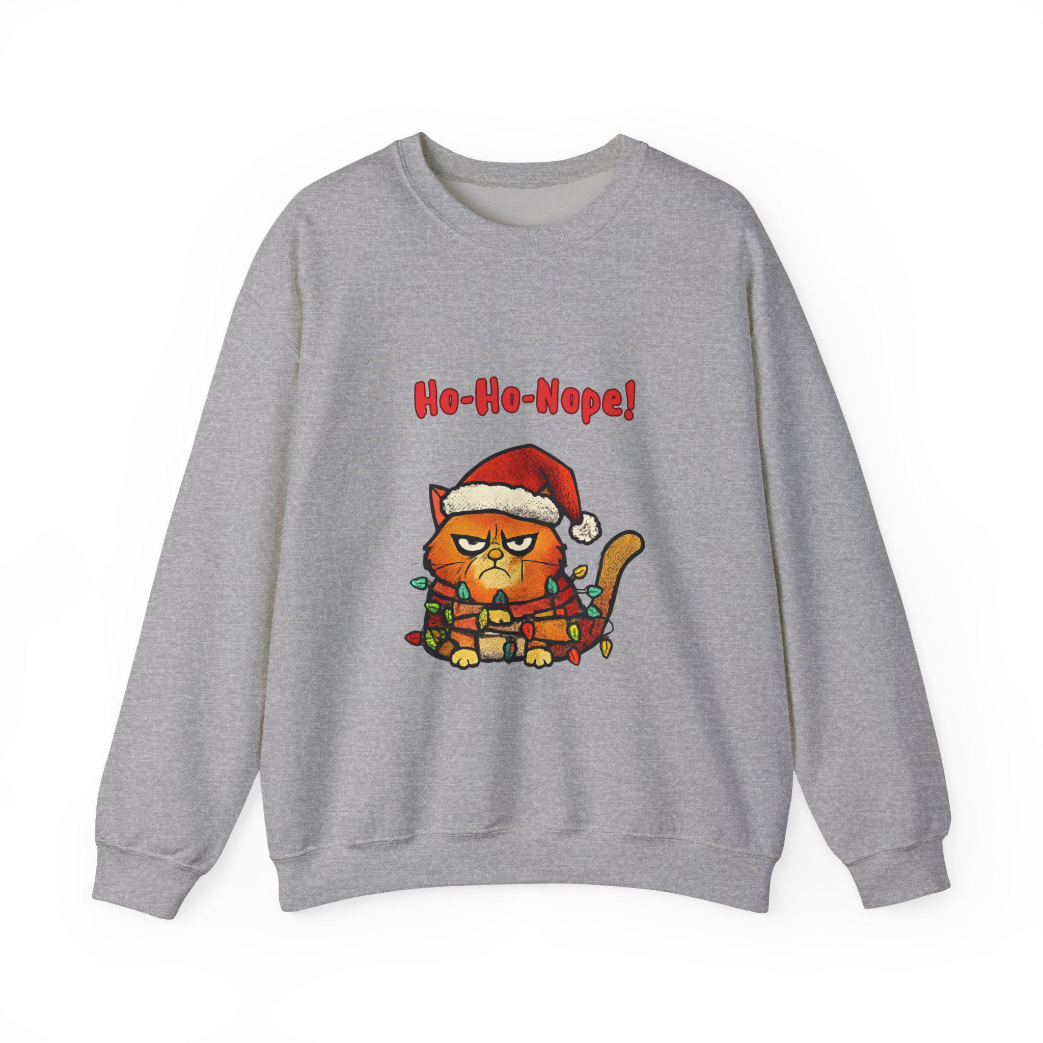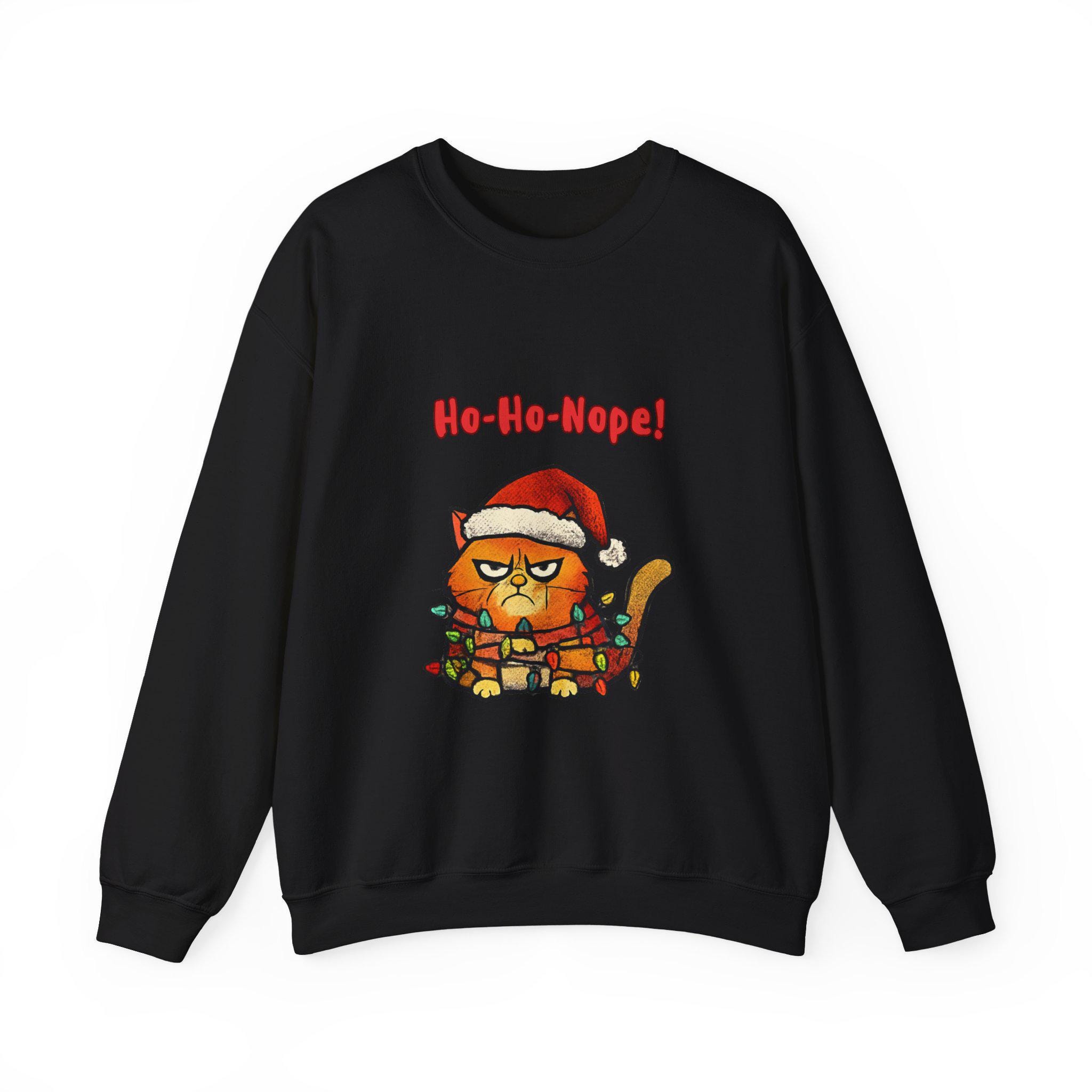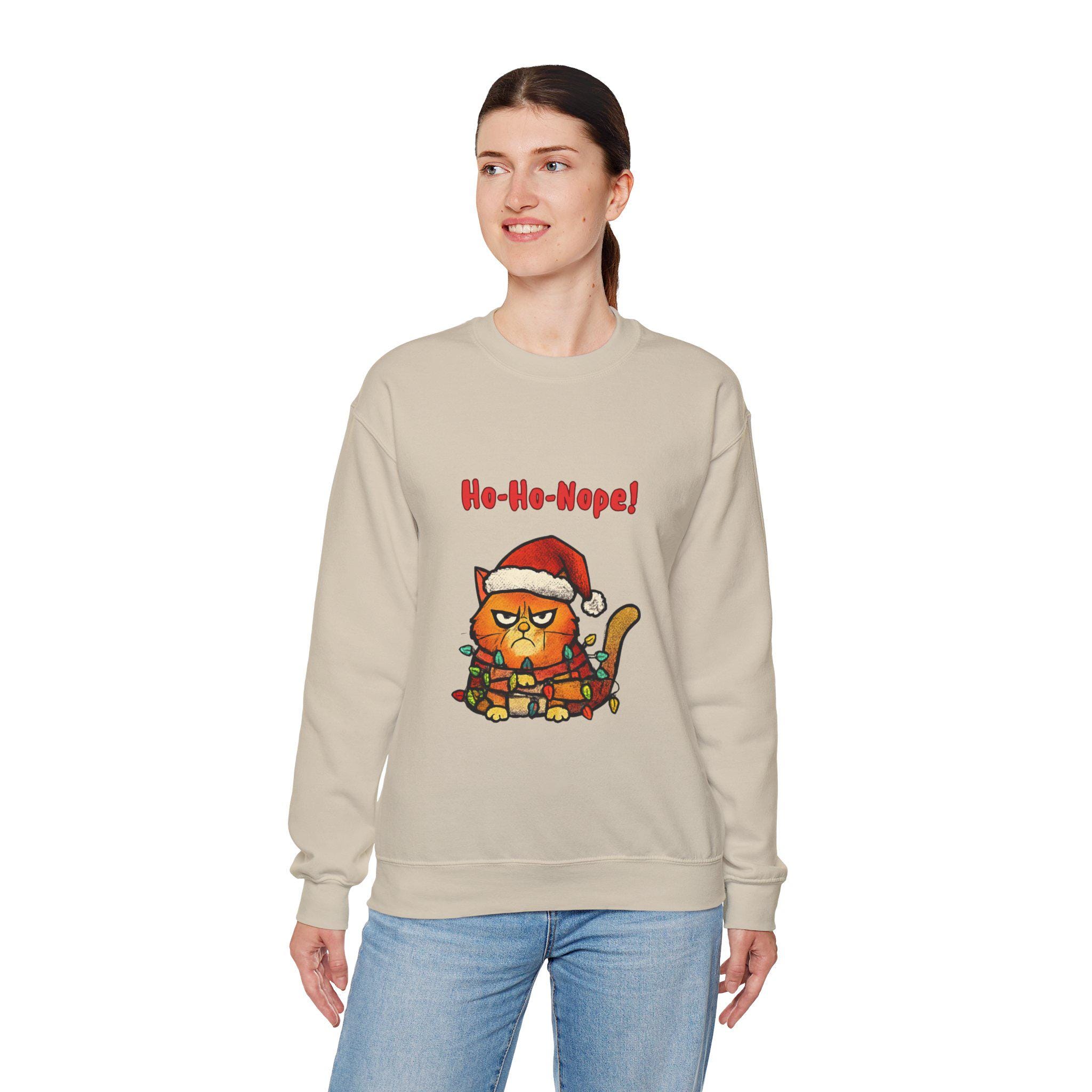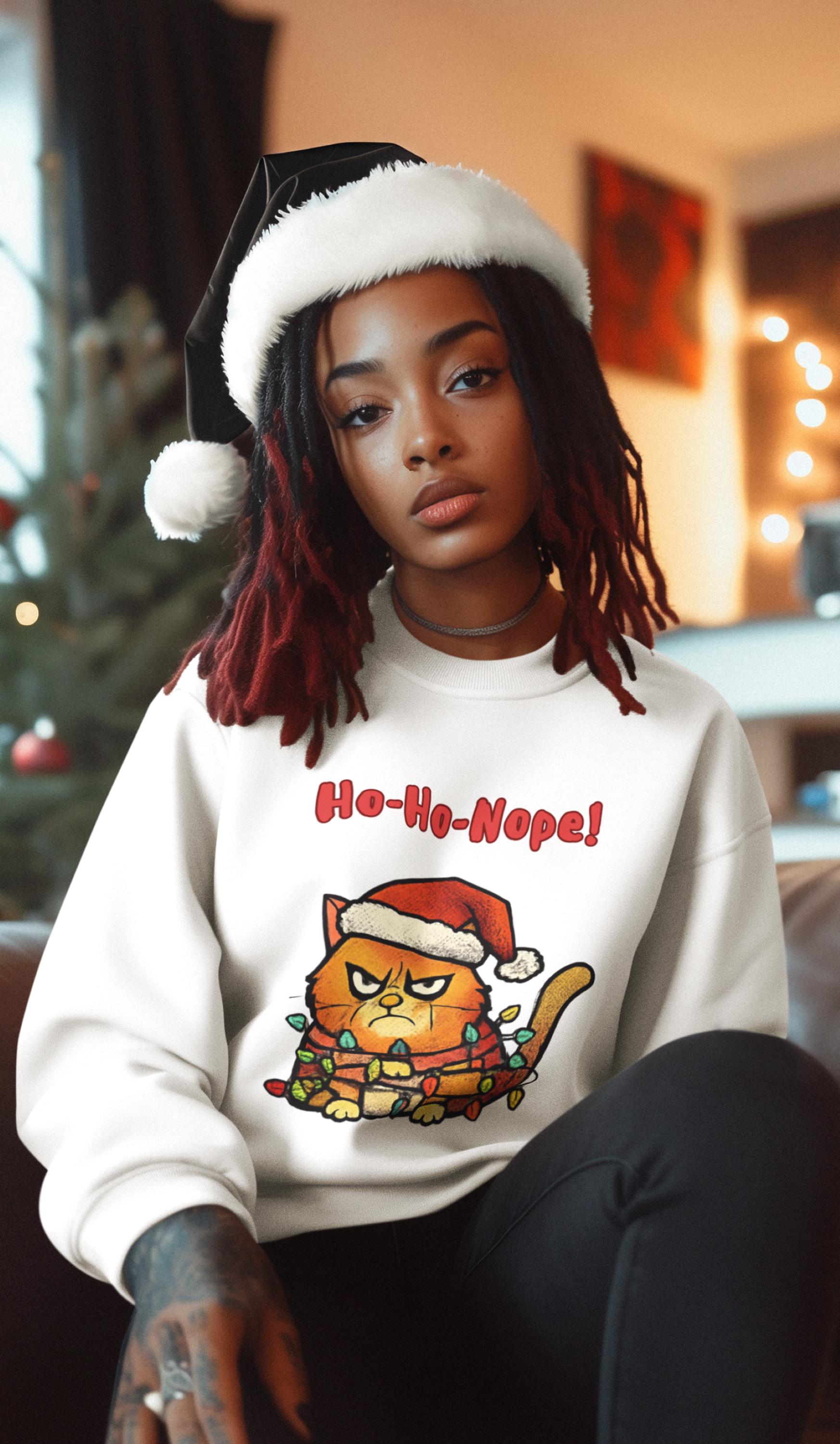 Cozy, cheeky, and built to last — this crewneck brings holiday attitude with a soft, structured fit. A grumpy, mittened cat in a Santa hat stares out from the chest with the caption “Ho-Ho-Nope!”, giving the sweatshirt a playful, low-effort humor that lands with anyone who prefers quiet sarcasm over jingling bells. Wear it on chilly mornings with coffee in hand, layered for movie nights, or at casual holiday hangouts where comfort matters more than formality. The medium-heavy cotton-poly blend feels warm without weighing you down, and durable double-needle stitching keeps it looking good through repeat wears and washes. Subtle details — like a tear-away neck label, tubular knit body for a clean silhouette, and optional embroidery placements for personalization — elevate this everyday staple into something both practical and personal.