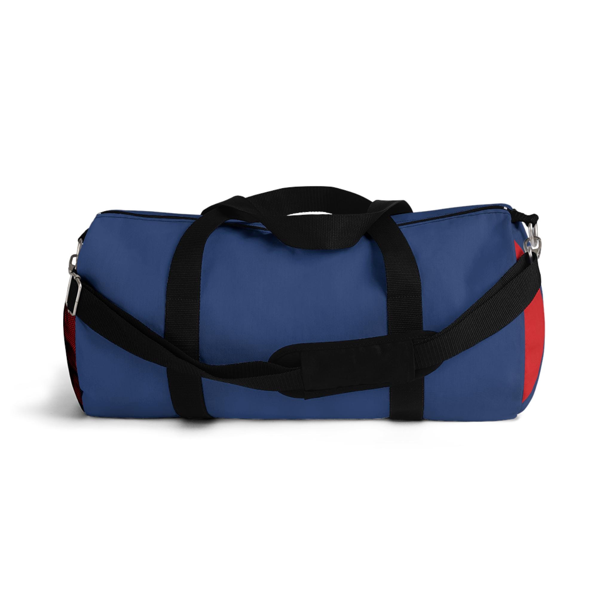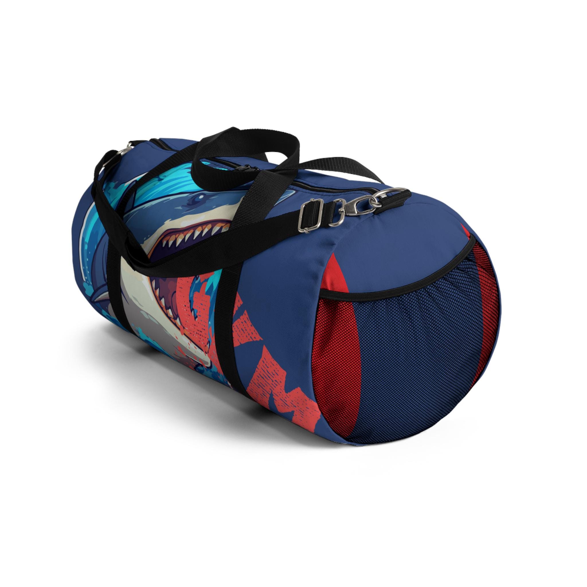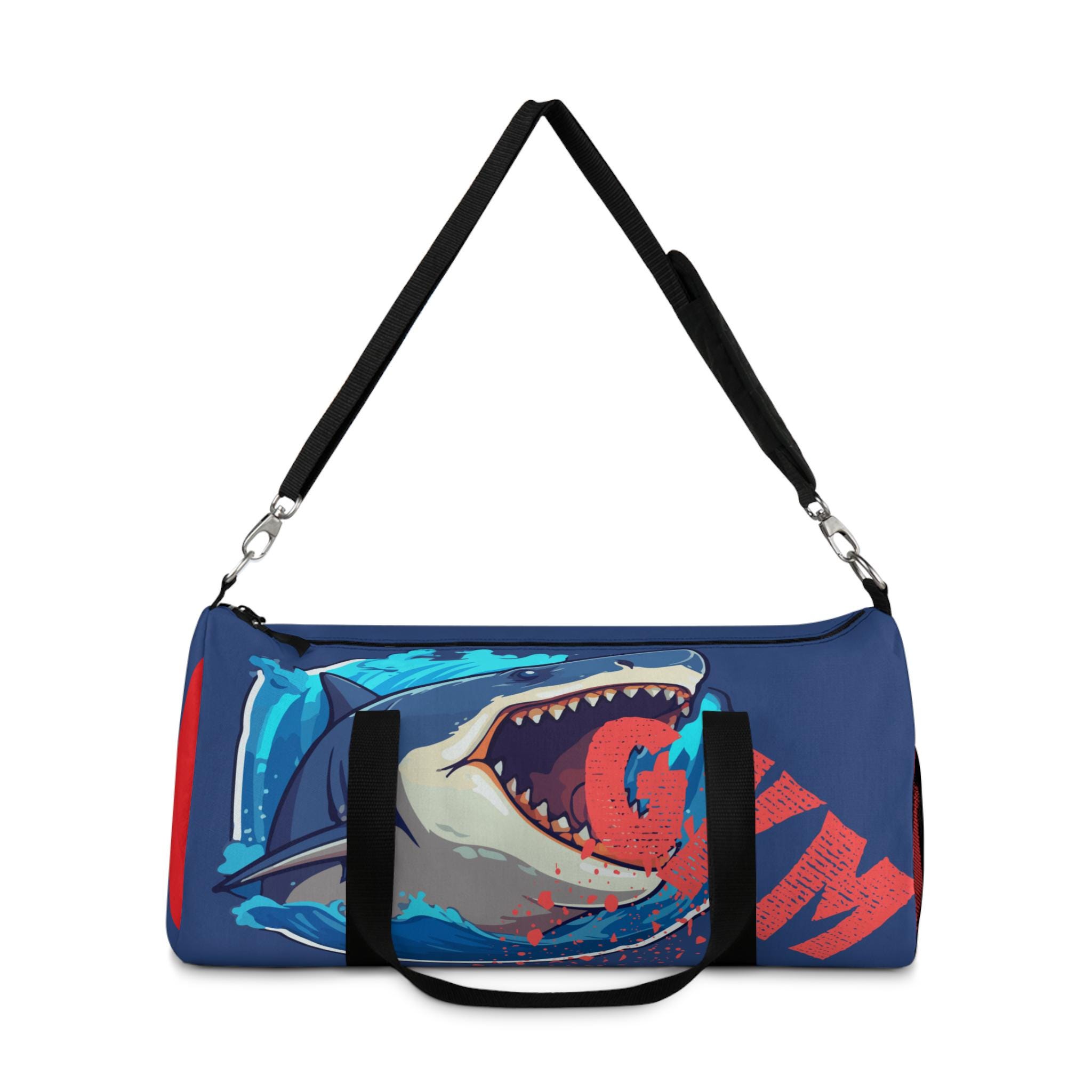 This duffel bag brings sea‑edge energy to every trip — bold, loud, and built to move. A fierce shark graphic erupts across a deep navy canvas, its open jaws and splashes of coral red making the bag easy to spot on crowded racks or gym floors. The roomy main compartment swallows clothes and gear, while an internal zip pocket and an exterior mesh side pocket keep small things sorted. Carry it by the short handles for quick runs or sling it over the shoulder with the padded, adjustable strap when you need hands free. Rugged 100% polyester Oxford canvas keeps the shape and dries fast after wet commutes, and the sewn‑in name tag and solid metal hardware add practical, travel‑ready details. It’s assembled in the USA from globally sourced parts and comes in two sizes to suit weekenders and daily commuters alike.