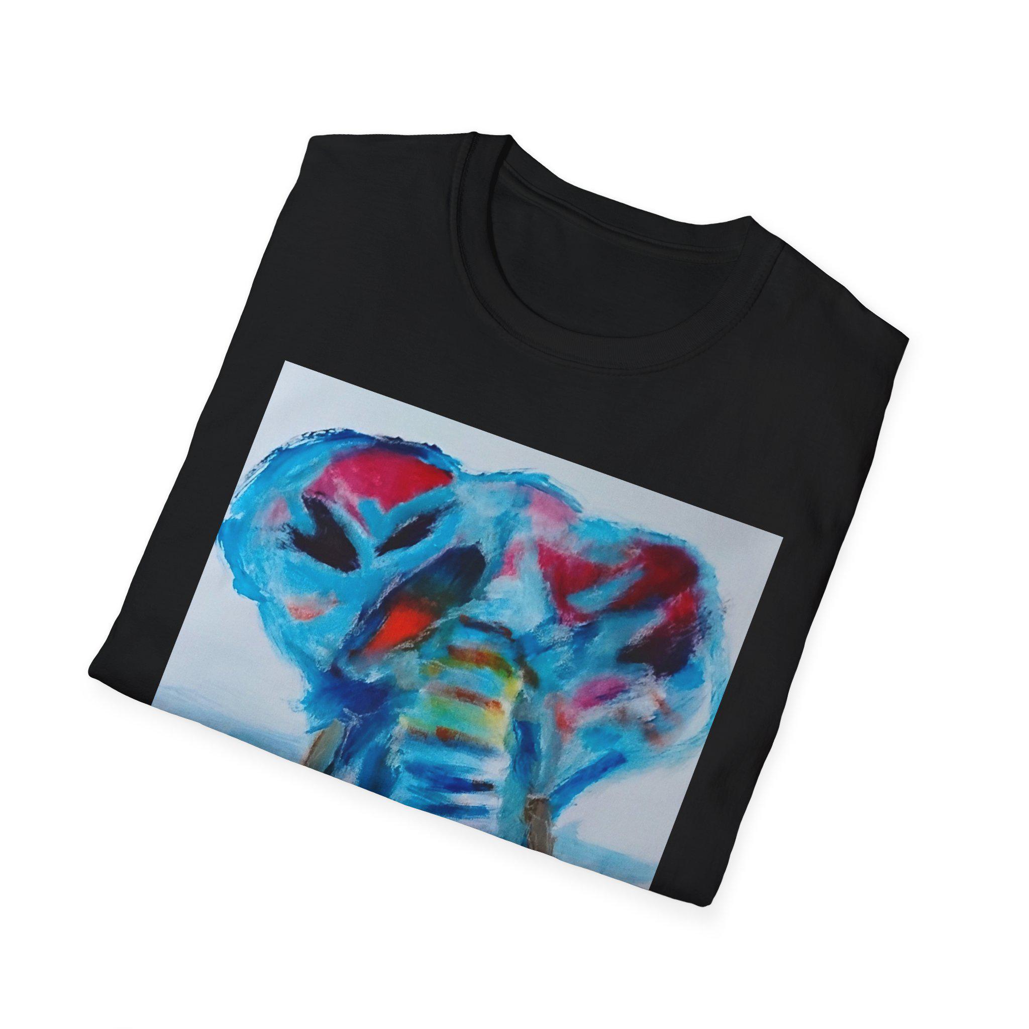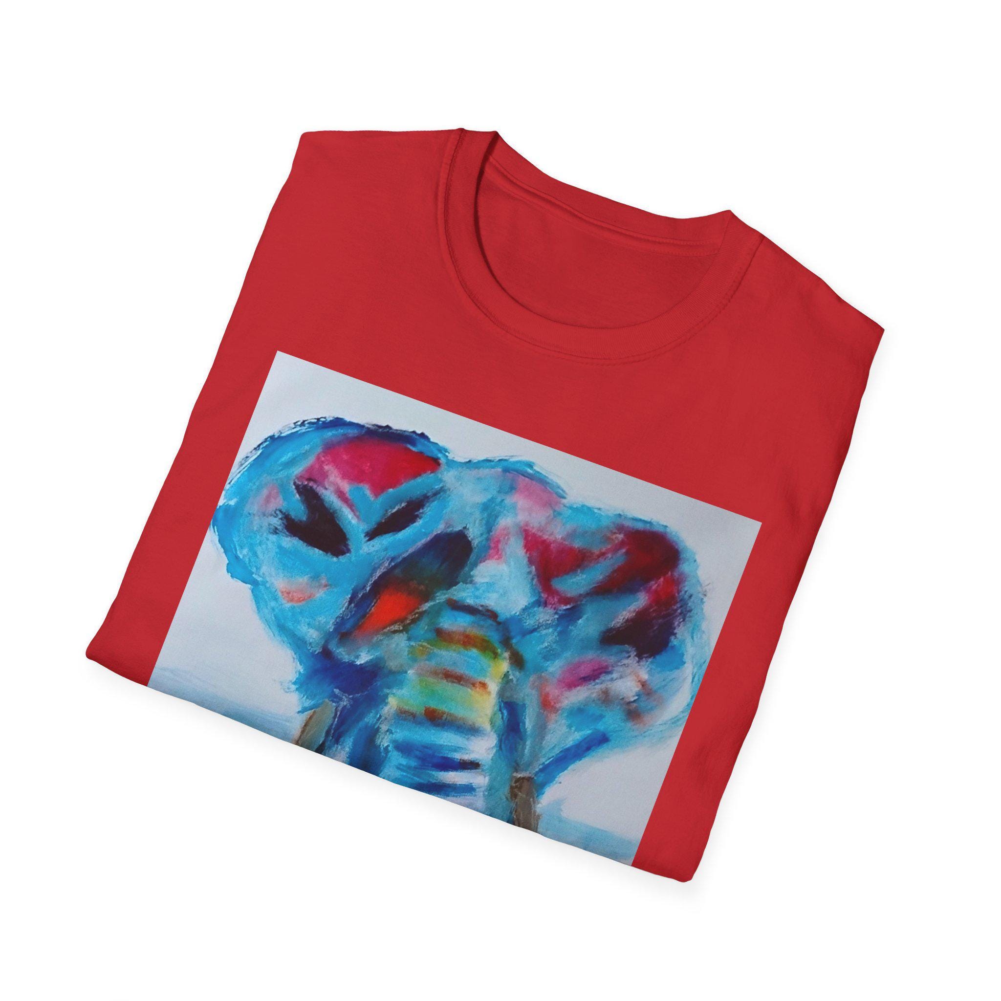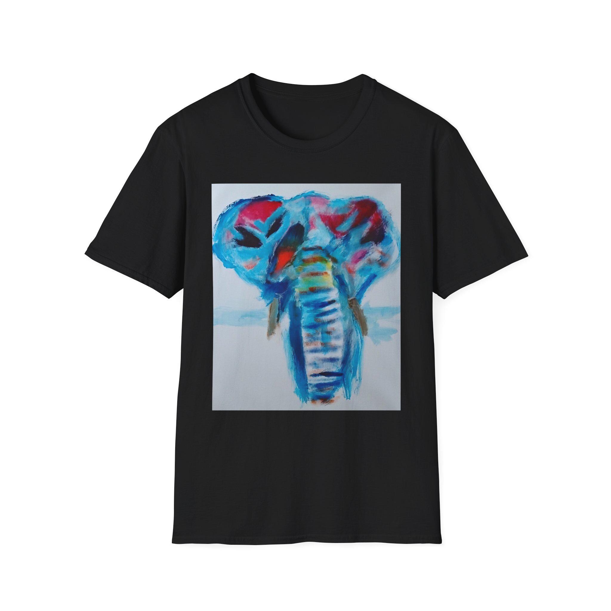 Bring bold color and expressive artistry into your everyday style with this wearable print of an original elephant painting by artist J. Jackson. This piece, created in his signature abstract-expressionist style, blends vibrant blues, reds, and subtle motion to capture the strength and spirit of the elephant.