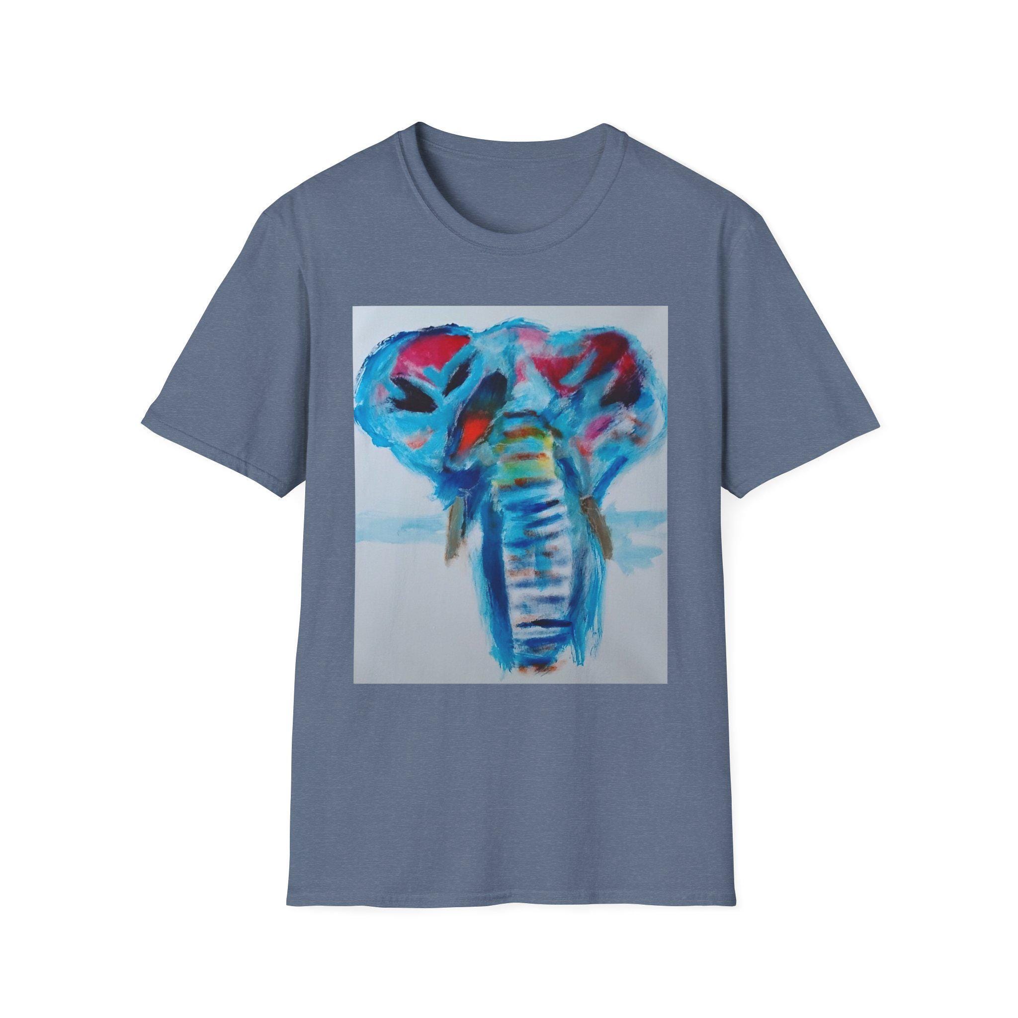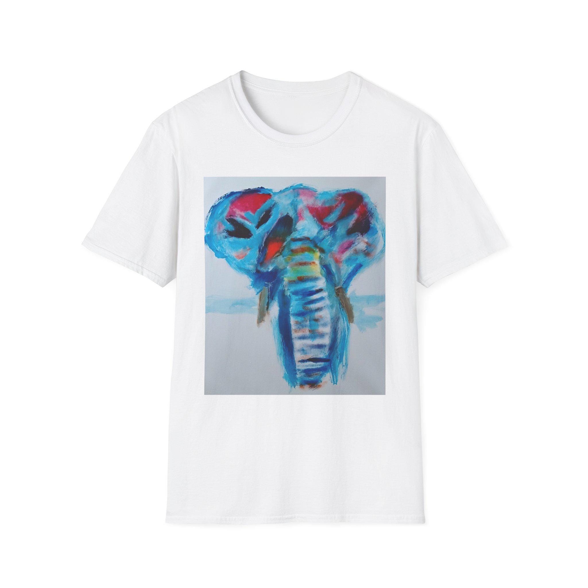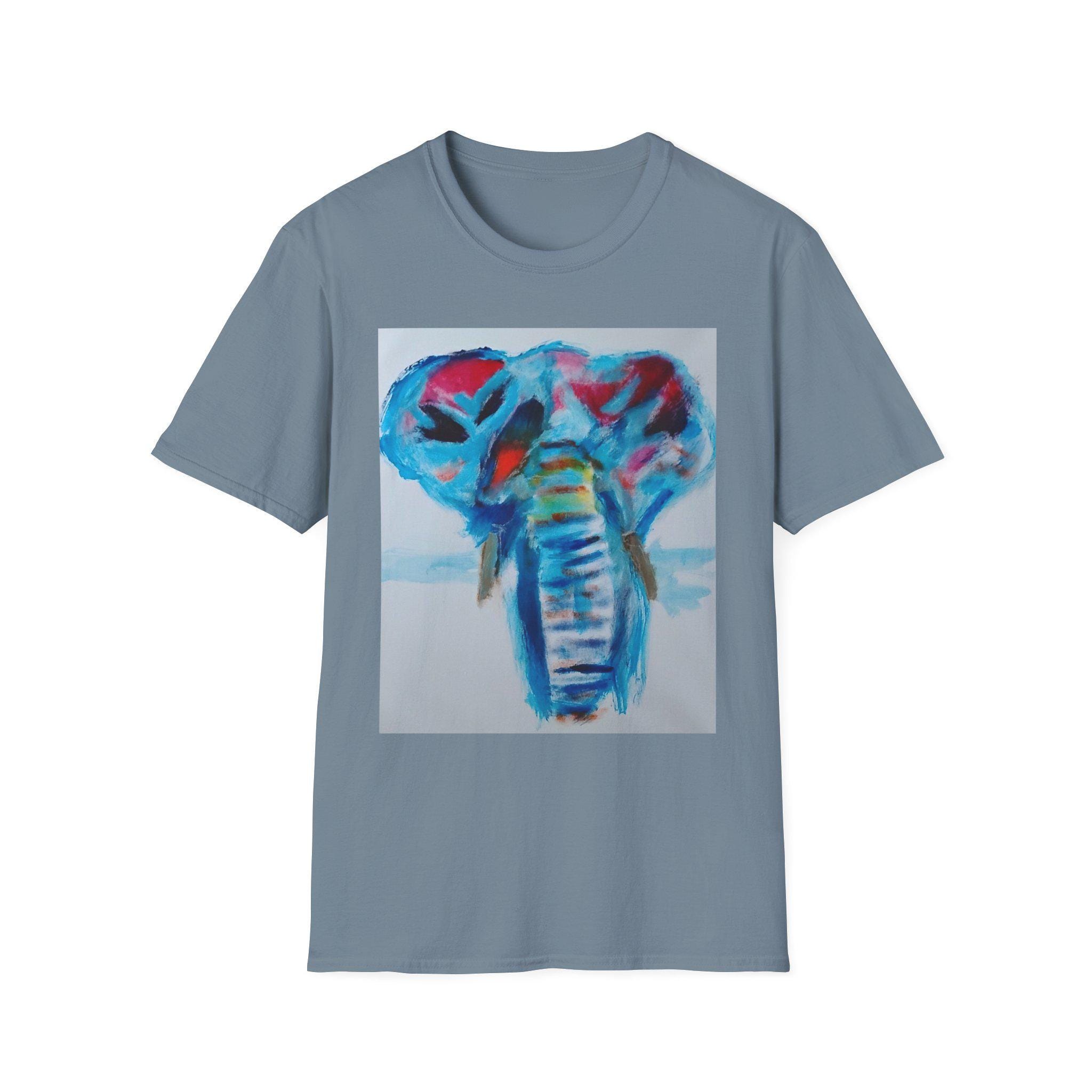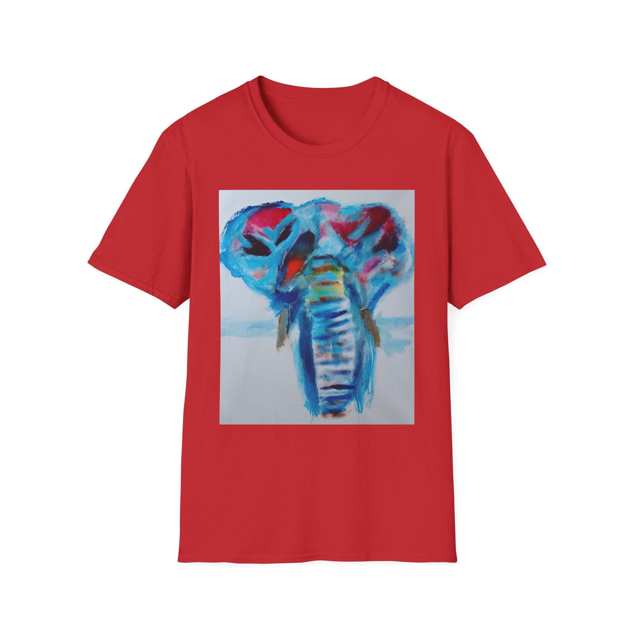 Bring bold color and expressive artistry into your everyday style with this wearable print of an original elephant painting by artist J. Jackson. This piece, created in his signature abstract-expressionist style, blends vibrant blues, reds, and subtle motion to capture the strength and spirit of the elephant.