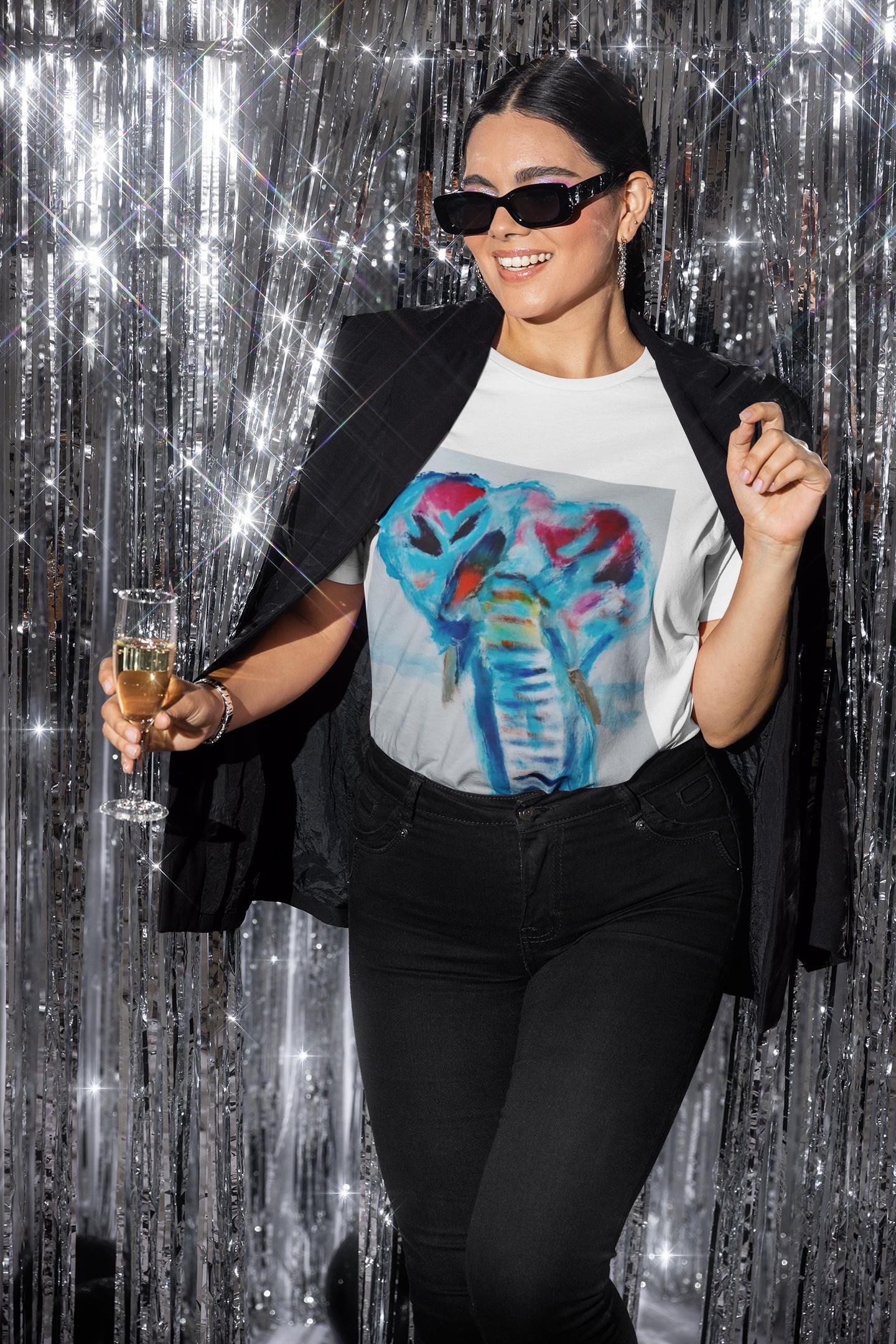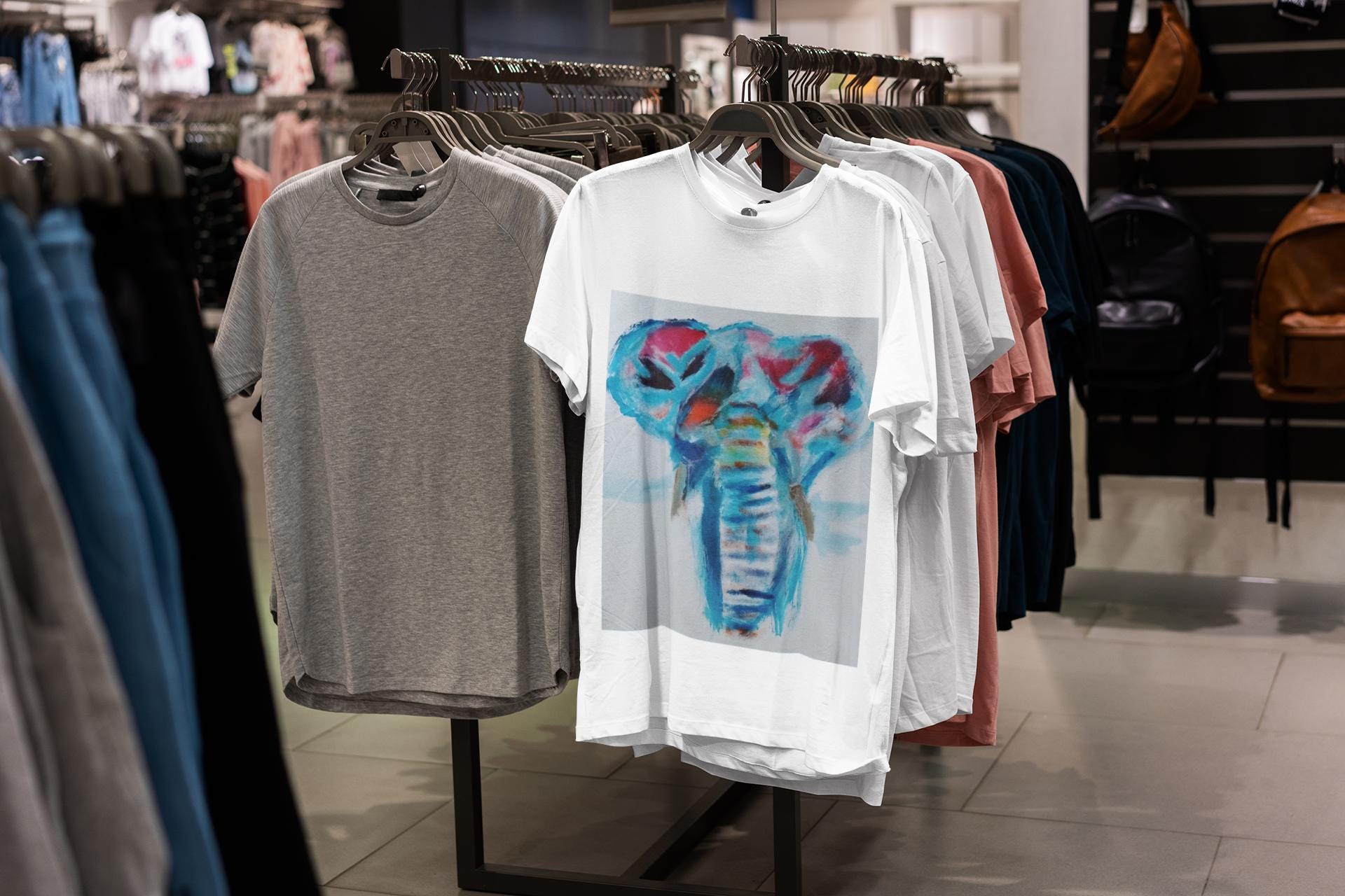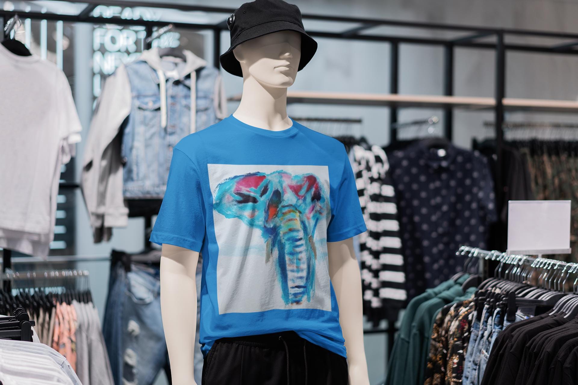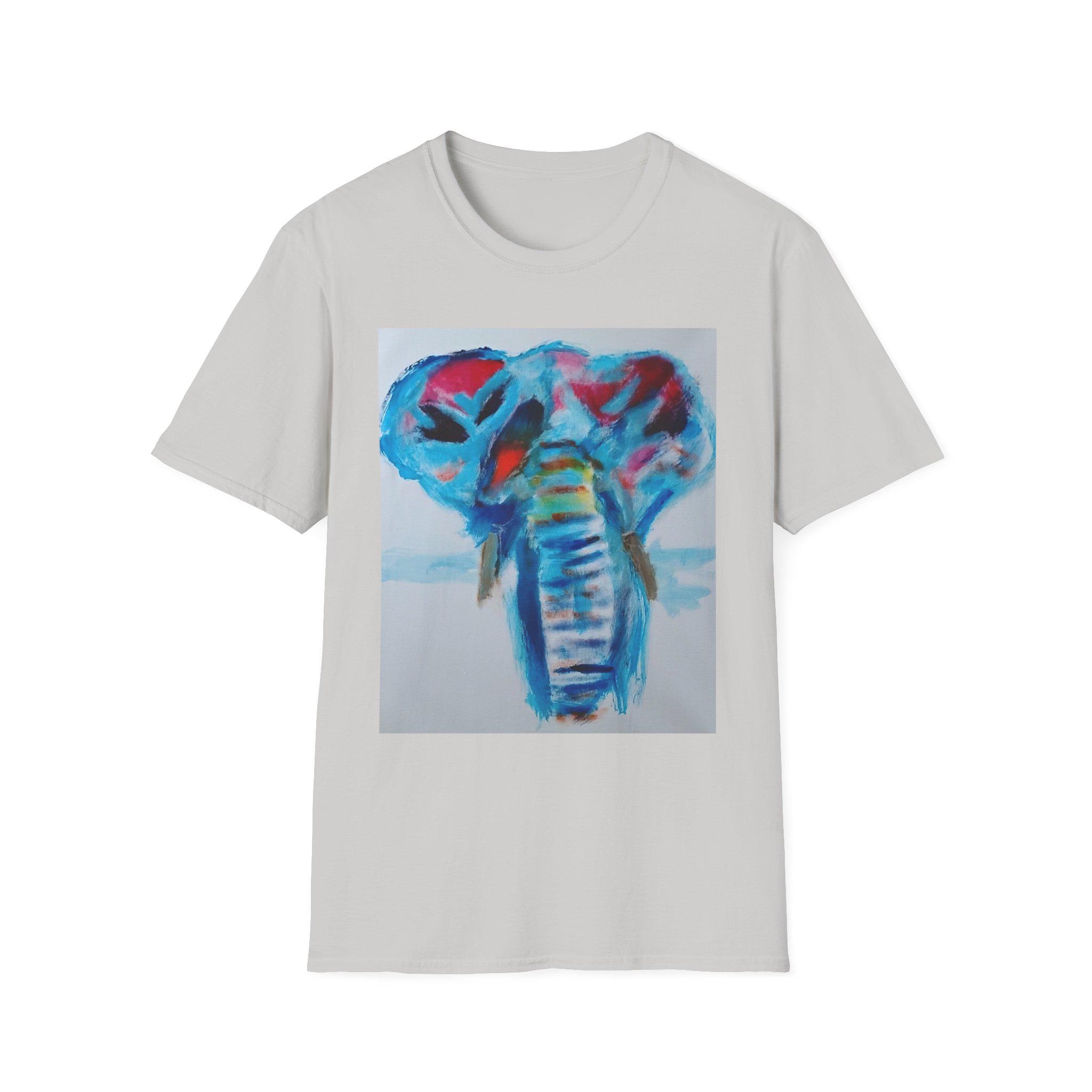 Bring bold color and expressive artistry into your everyday style with this wearable print of an original elephant painting by artist J. Jackson. This piece, created in his signature abstract-expressionist style, blends vibrant blues, reds, and subtle motion to capture the strength and spirit of the elephant.