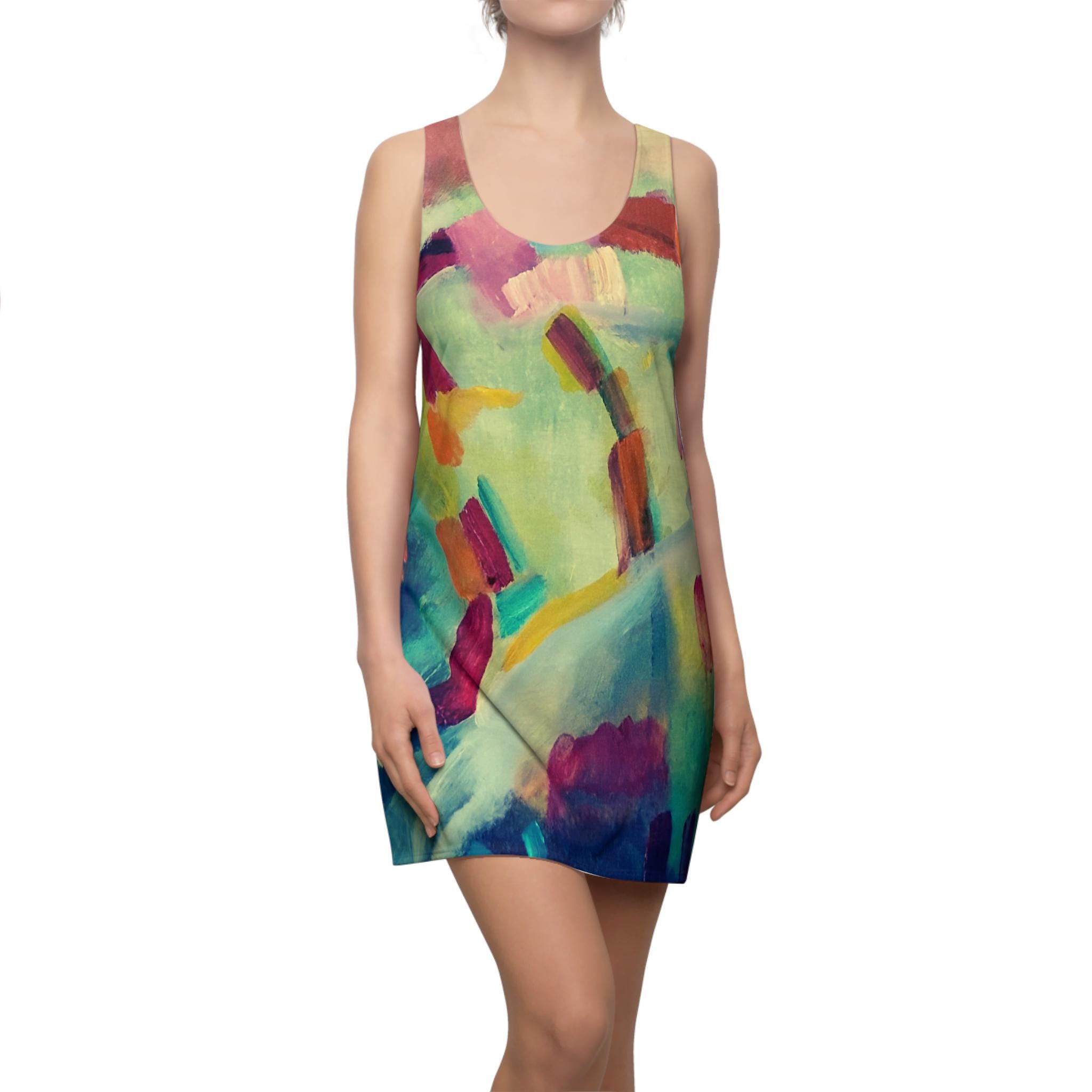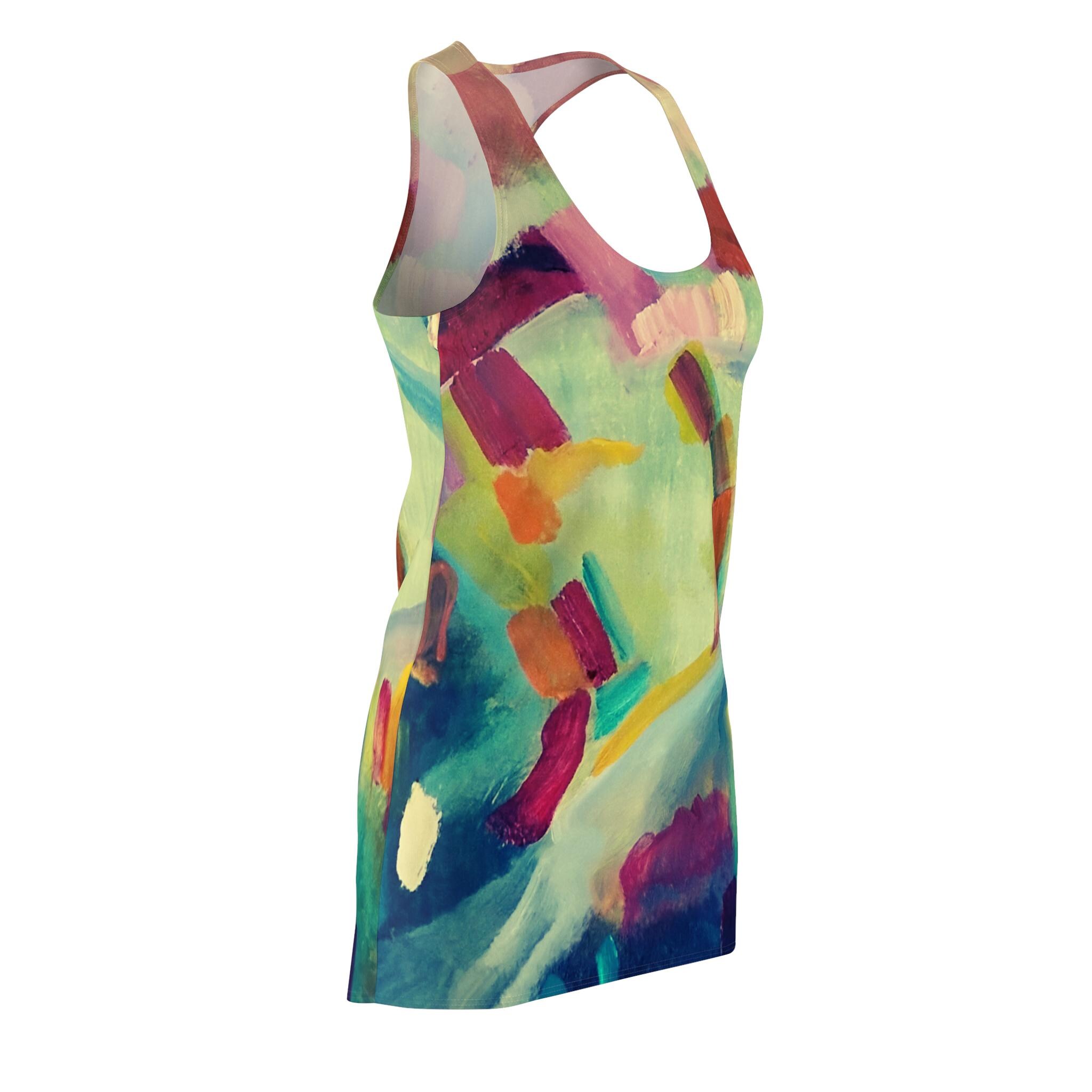 A lively racerback dress that feels like stepping into a loose, colorful painting. Lightweight and breathable, the smooth polyester fabric skims the body with a sporty silhouette that moves with you. Splashes of teal, coral, mustard and soft pastels blend into an abstract composition that reads as wearable art designed from an original abstract painting—bright enough to lift your mood, subtle enough to layer under a jacket. Comfortable tagless construction and durable side seams keep the shape through days of movement, while the all-over print maintains its vibrancy wash after wash. Wear it to gallery strolls, weekend markets, or warm-weather gatherings when you want color and ease without fuss.