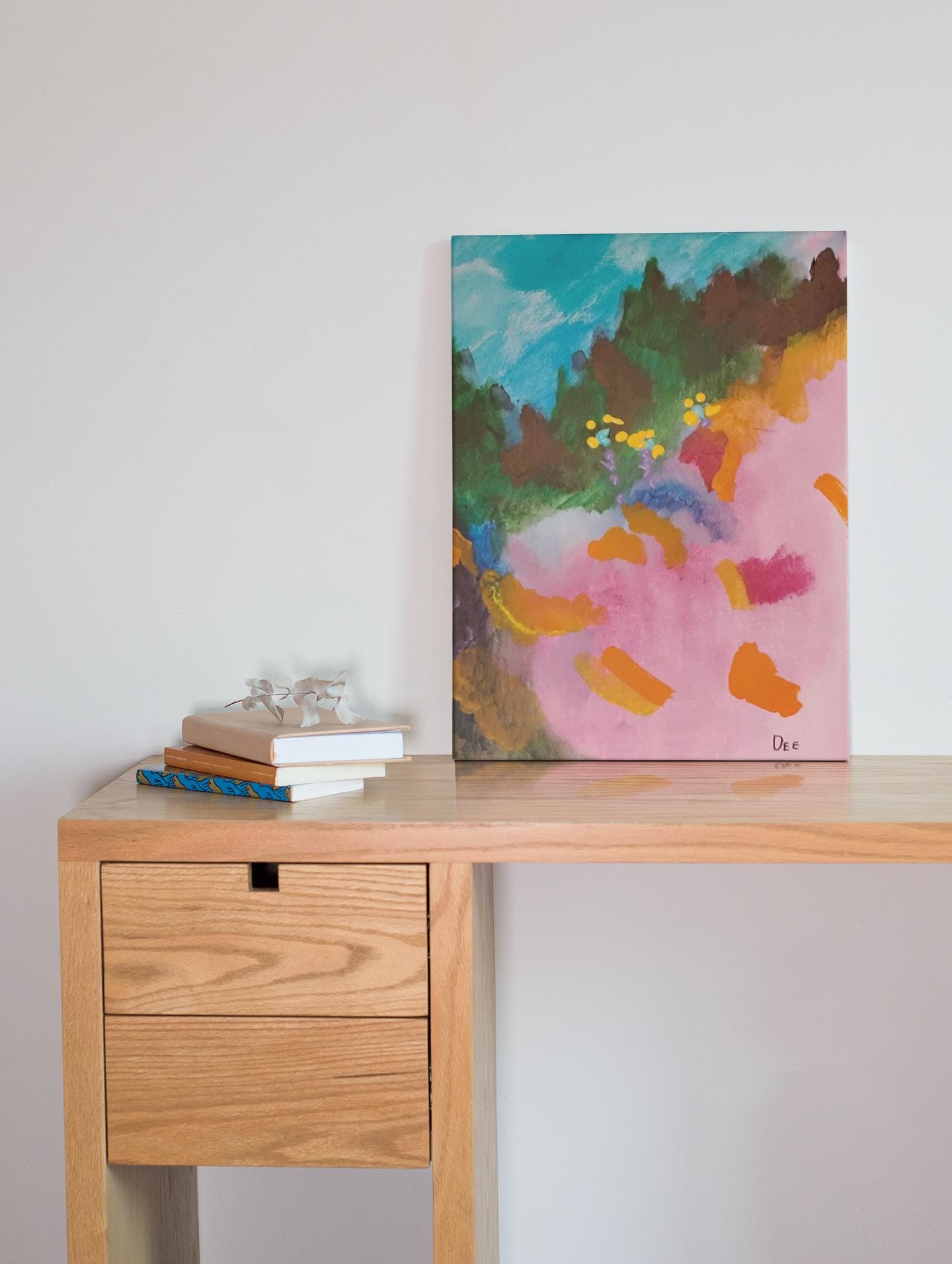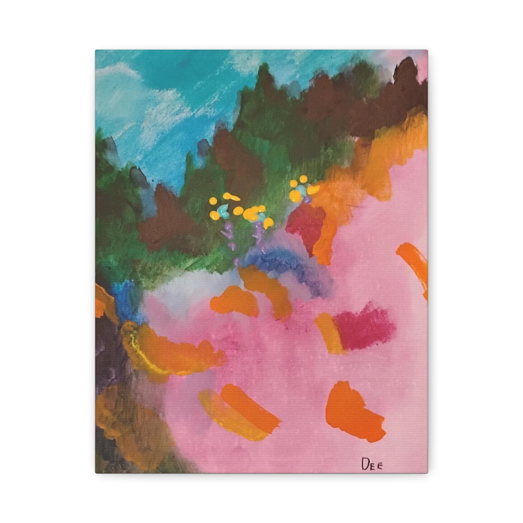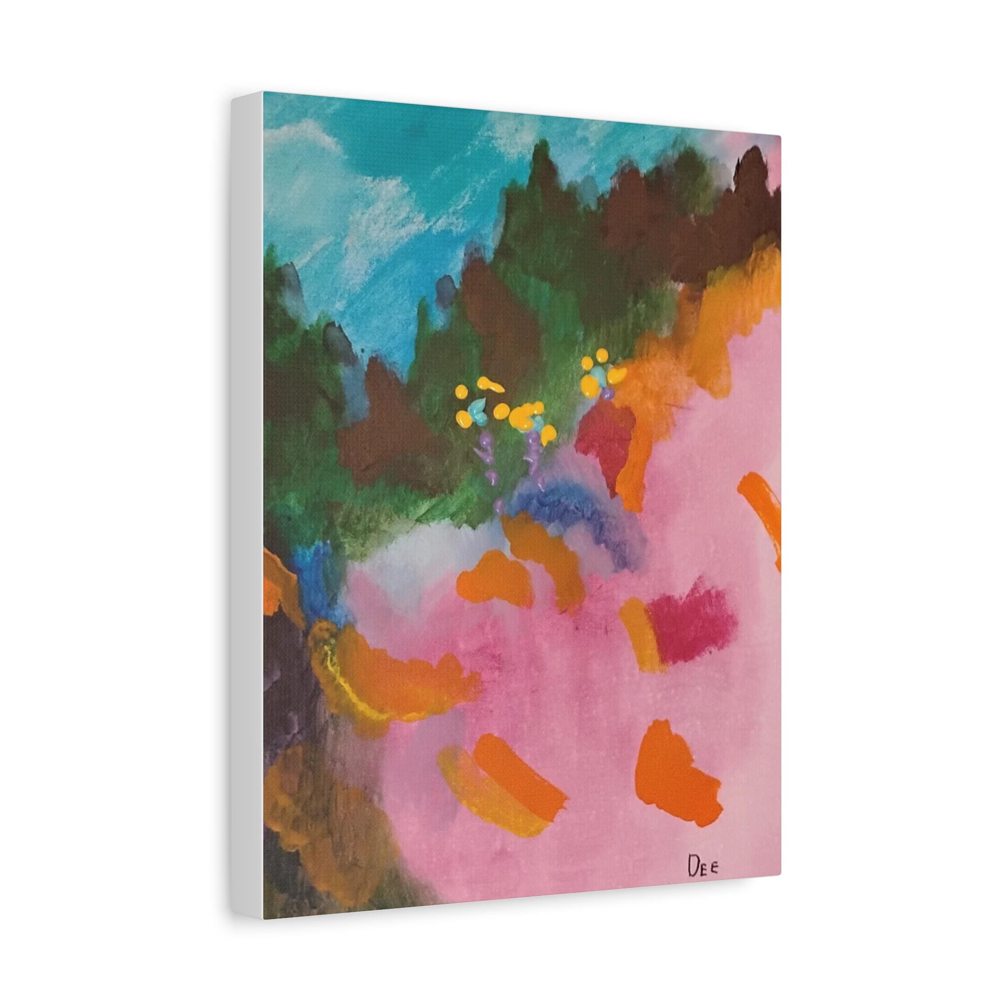 From an original acrylic painting by our jjlimeart designs artist. Comes in two sizes on A vibrant stretched canvas that brings lively color and painterly texture to any room. Loose, expressive brushstrokes of teal, deep green, and warm orange float over a blush-pink field, suggesting wildflowers at the edge of a forest. The matte finish softens glare and invites close viewing, while the stretched pine frame gives a solid presence on the wall. Hang it over a reading nook, gallery wall, or entryway to add a spontaneous, artful energy that feels both modern and hand-painted.