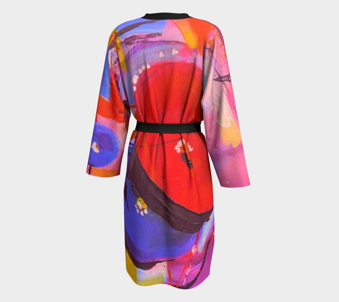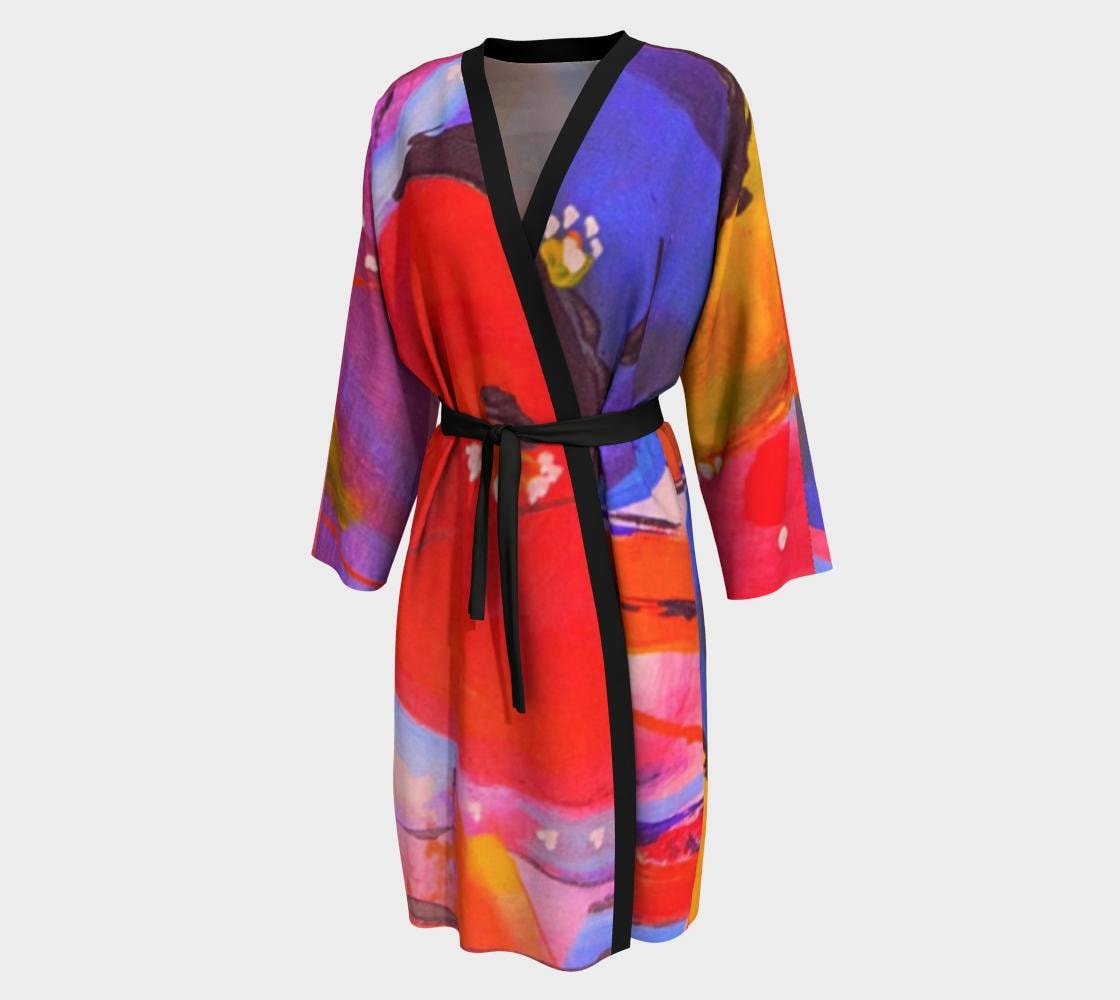 peignoirs from an original abstract painting truly wrap you in art. Available in Peachskin Jersey fabric: • Long version of our classic kimono hangs almost to your knees • Lightweight super soft jersey fabric in 92% polyester, 8% spandex • Every kimono robe is printed and sewn by hand in Montreal, Canada • Comes with knit bamboo rayon fabric trim and matching chiffon belt • Clear look elastics to hold the belt and blend in with your print • Vibrant print will never fade with wear or washing • Micro overlock hem finishing • Machine wash in cold water with a phosphate-free detergent, hang to dry