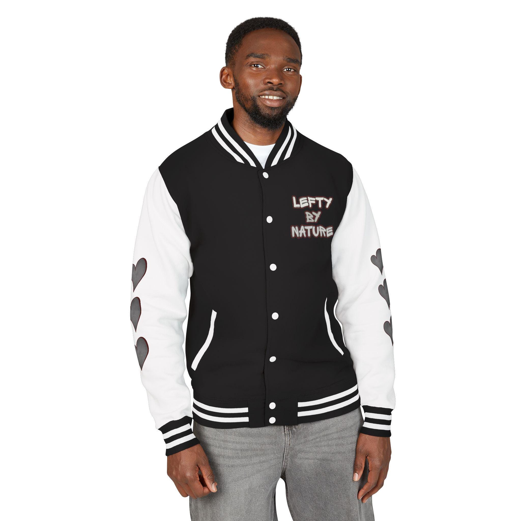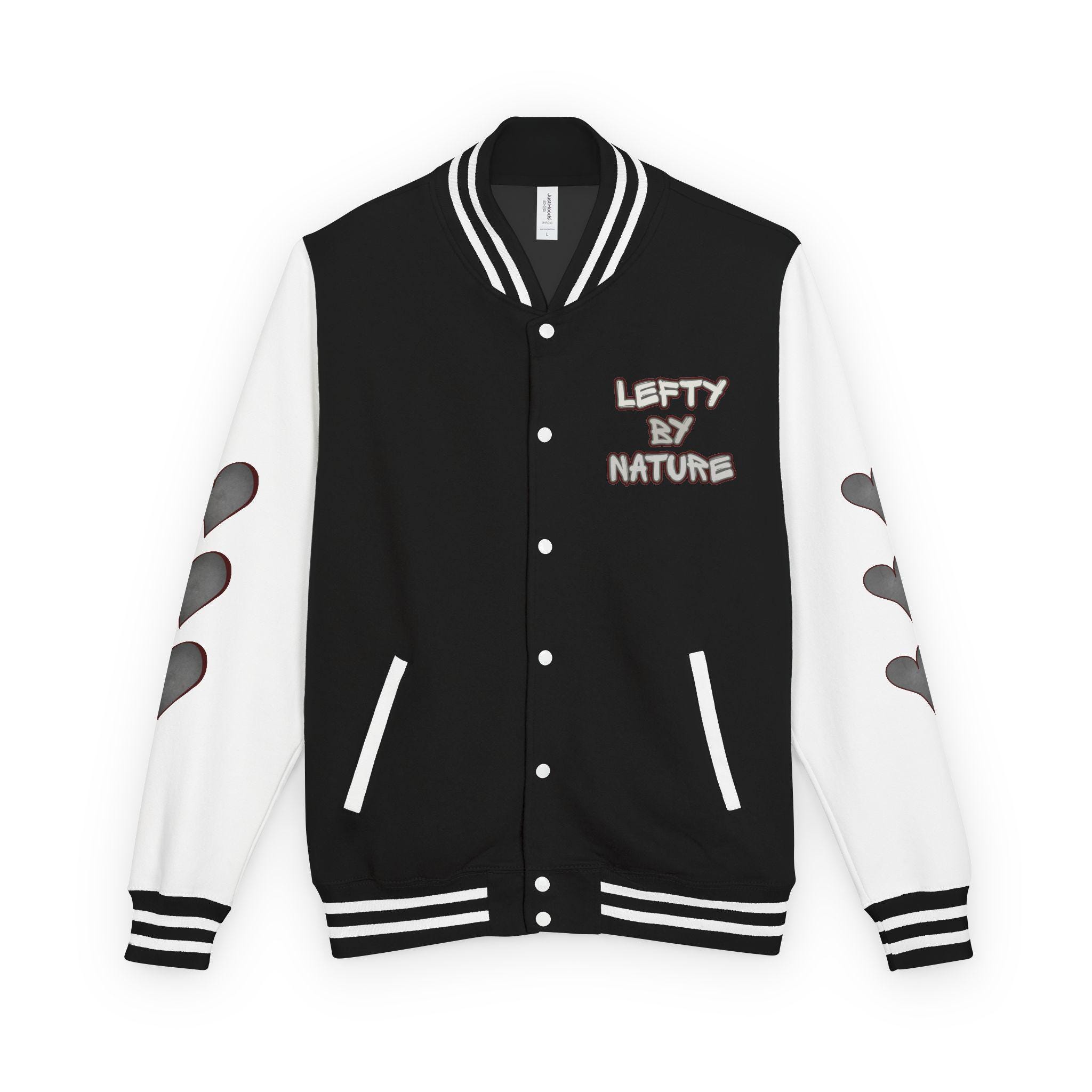 This classic letterman jacket brings vintage varsity energy with a modern, personal twist. The black body contrasts crisp white sleeves stamped with a row of heart cutouts down each arm, while a soft chest patch reads “LEFTY BY NATURE.” The medium-heavy, garment-dyed fabric feels broken-in from day one, draping with substance and warmth. Wear it to skate nights, coffee runs, campus strolls, or low-key gigs — it reads like a quiet declaration: playful, intentional, and a little rebellious. The sewn-in label and sturdy construction nod to long-lasting wear, while the soft ringspun cotton blend keeps the jacket comfortable through seasons.