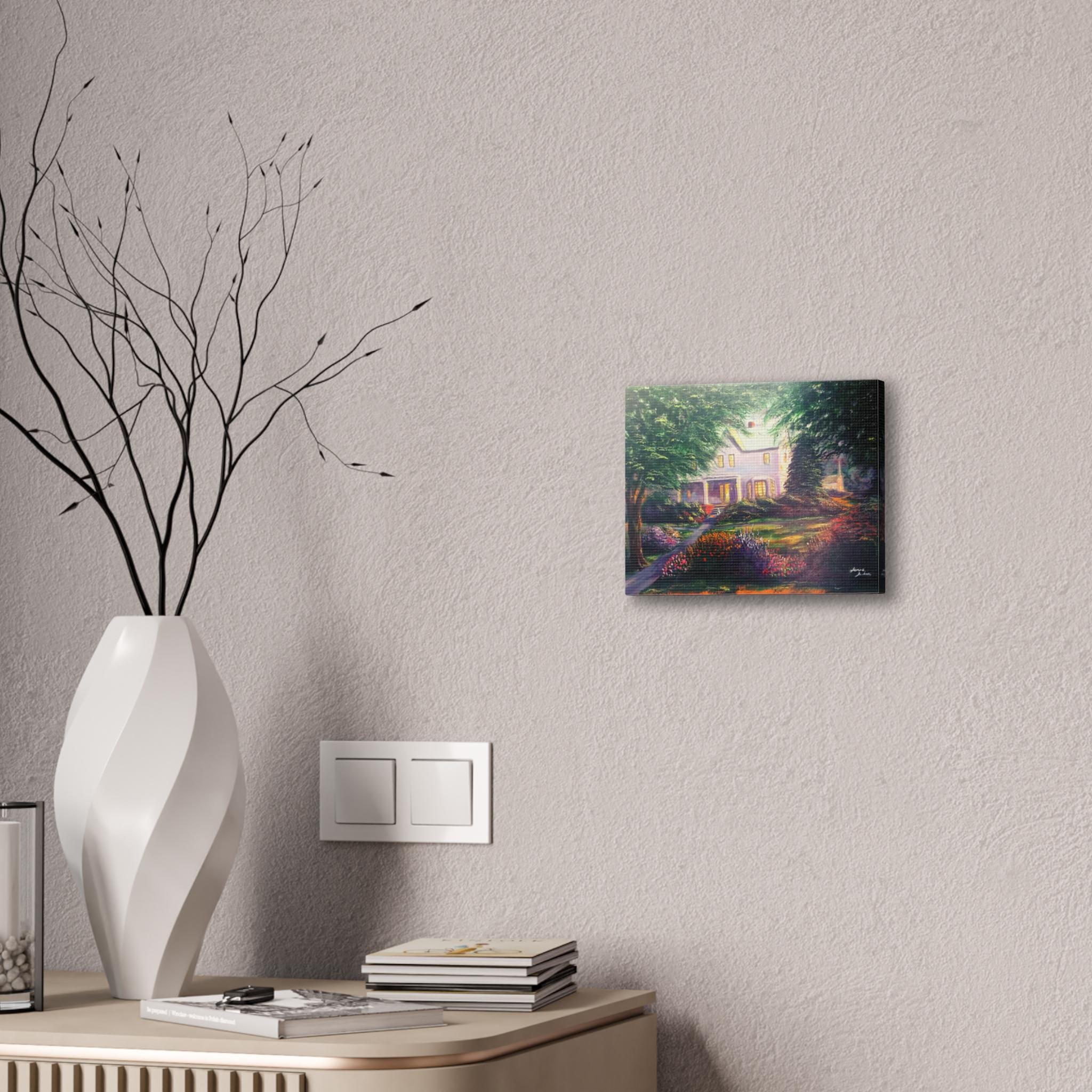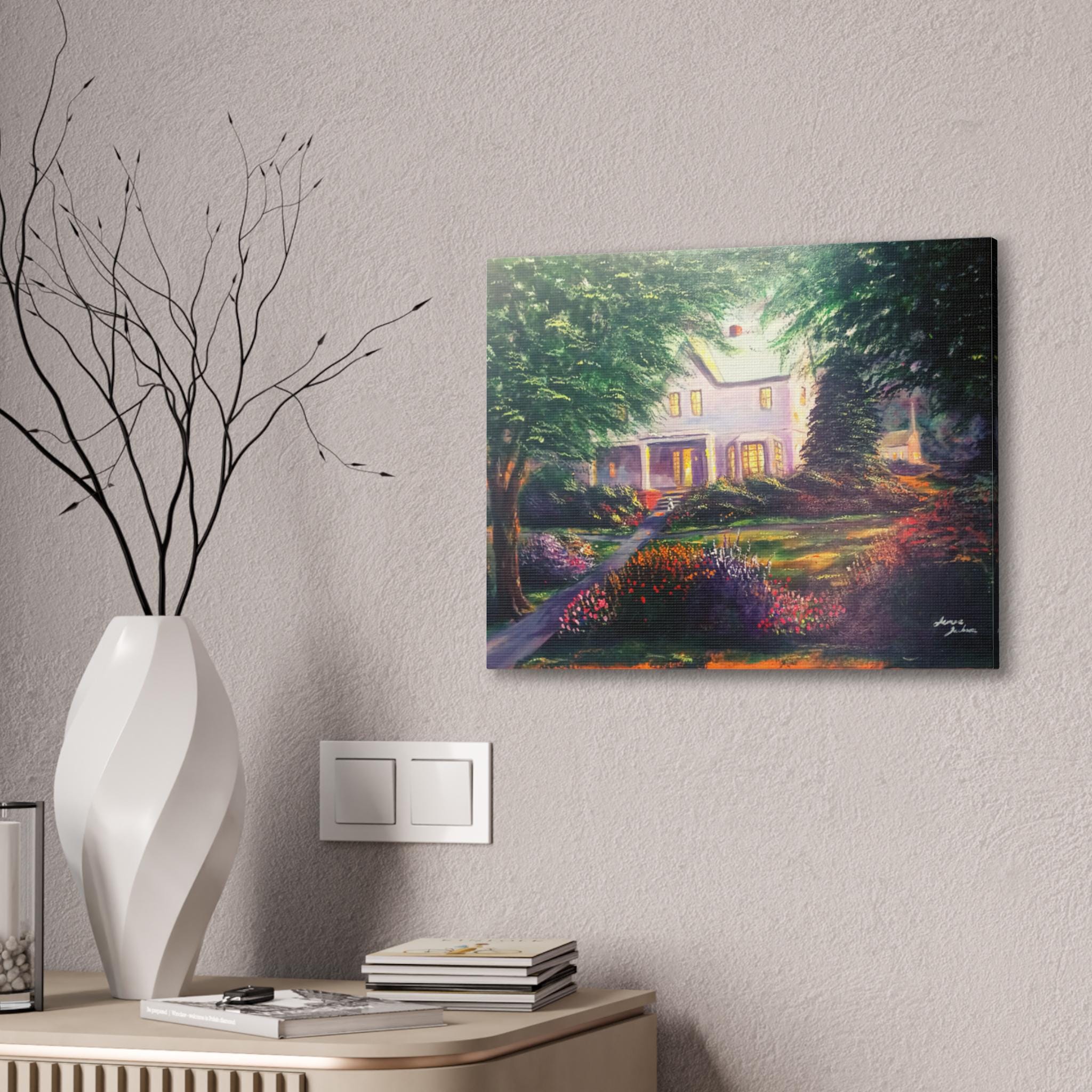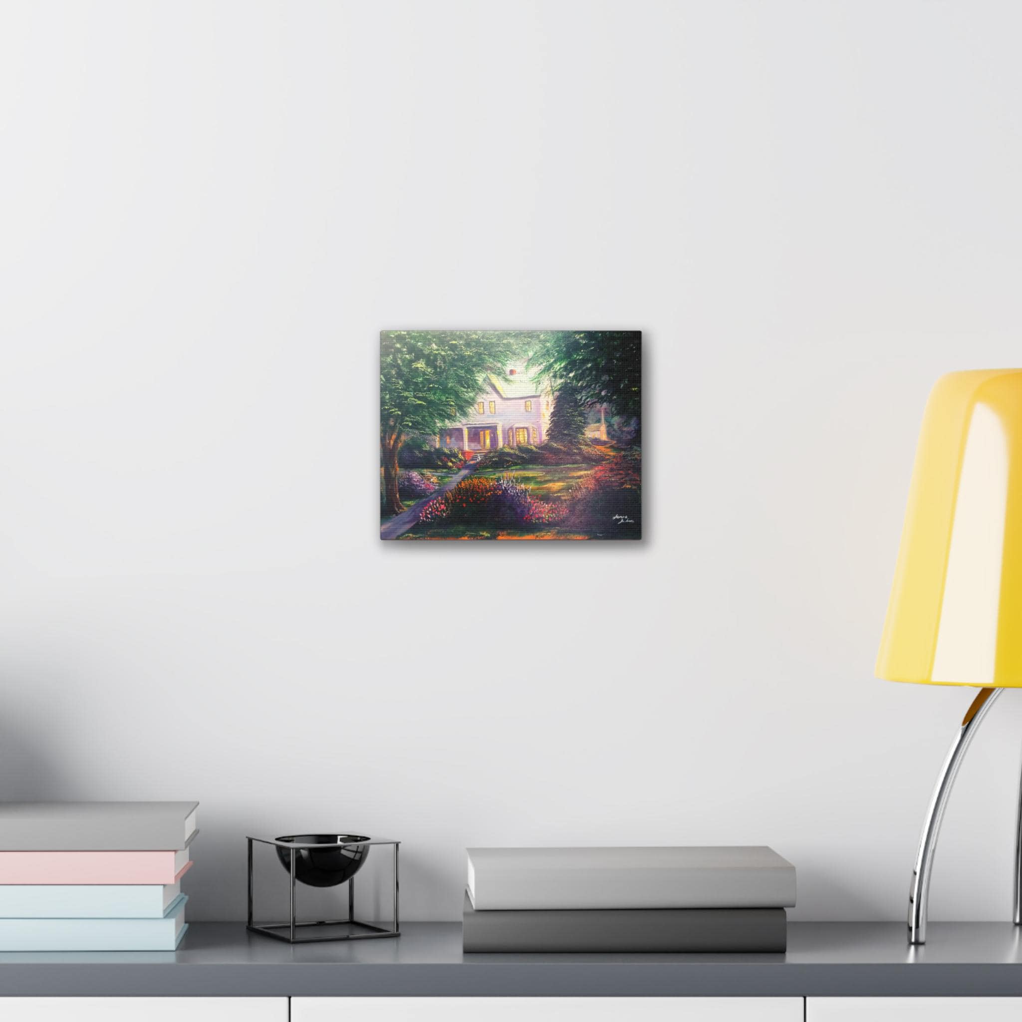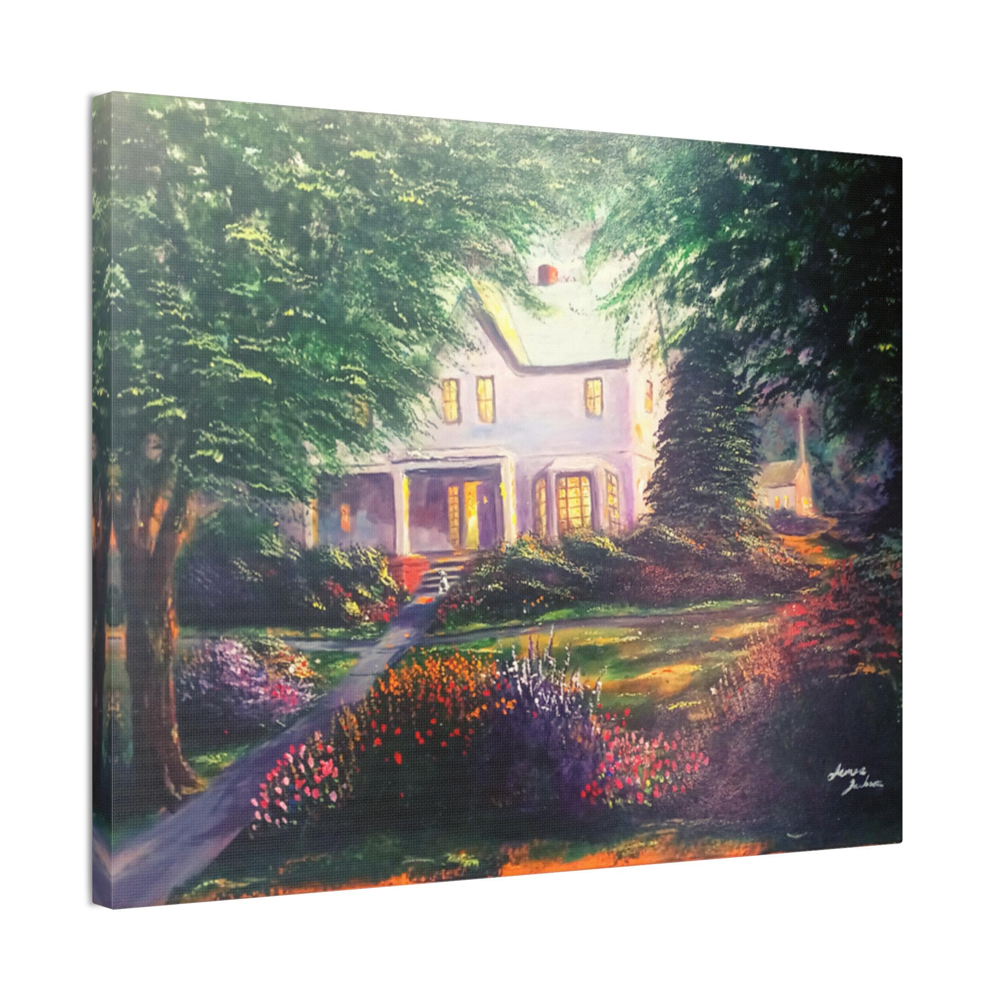 A warm, gallery-quality stretched canvas that brings a sunlit garden and cozy home to your wall. The scene settles into soft, painterly light — early evening glow through tall trees, a flowered pathway, and a welcoming porch. Hung in a living room, hallway, or study, the canvas invites quiet moments and gentle reflection. The textured polyester surface and vibrant inks keep the color depth and brush-like details visible from across the room. Arrives ready to hang with included hardware and small QR code on the back for care or provenance information.