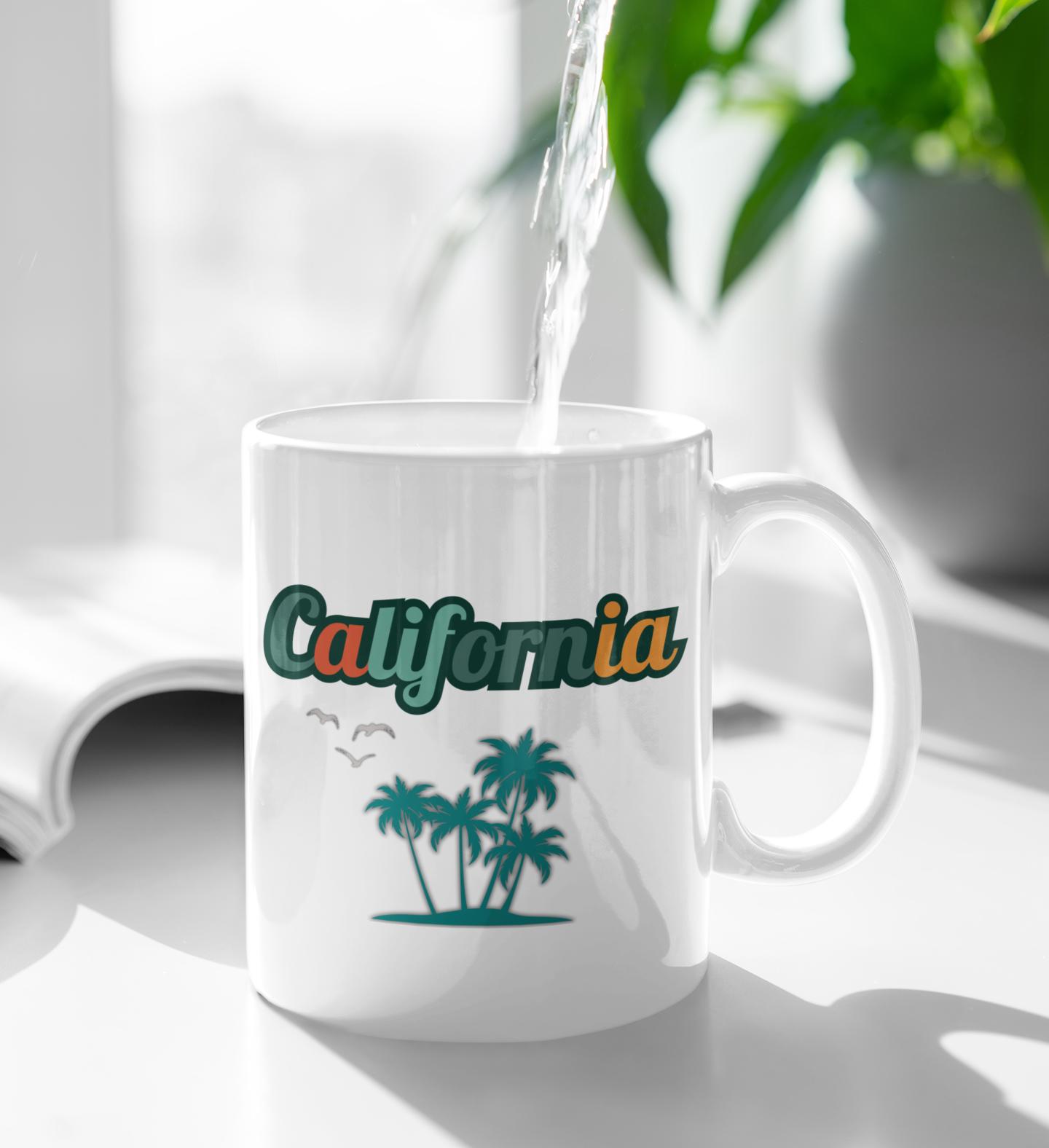double sided 'California' design for the bad ass ambidextrous-Chuck Norris type who can sip with both hands. This crisp white ceramic mug carries a sun-washed retro script and a small cluster of palm silhouettes — a quiet nod to coastal drives, boardwalk breakfasts, and salt-air mornings. It feels light in the hand, the C-handle offering an easy grip as you settle into a window seat or step out onto a balcony. The artwork is calm and nostalgic, the kind that nudges you to breathe deeper and remember why you chase warm horizons. Bring it out on laid-back weekends, set it beside a well-loved paperback, or keep it by your desk to summon a little coastal ease between busy tasks.