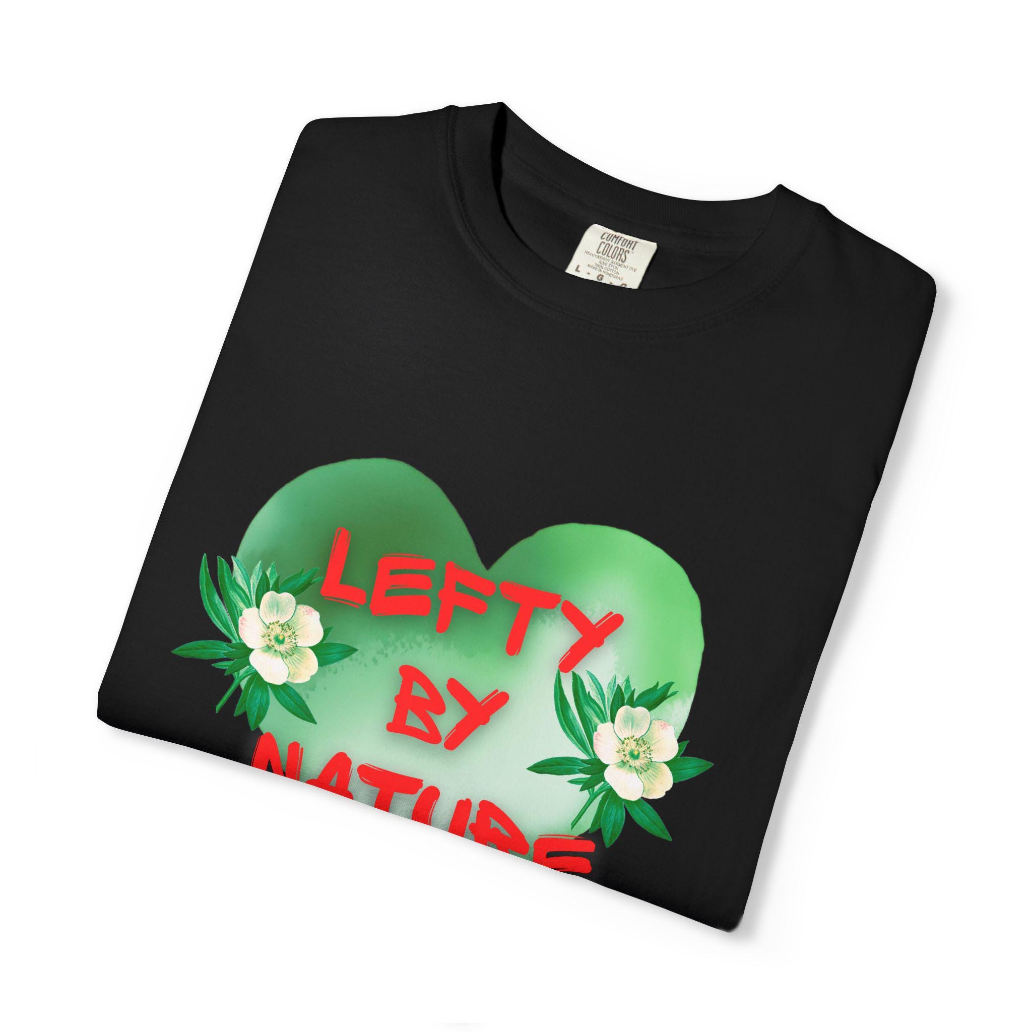 A relaxed, garment-dyed cotton tee that wears like an old favorite from the first pull-on. The soft, heavyweight knit and tubular construction give it a substantial, lived-in feel while the bold green heart artwork and hand-painted “LEFTY BY NATURE” lettering make a playful, proud statement. Subtle floral accents soften the graphic, so the shirt reads both cheeky and sincere. It layers easily under a jacket or stands alone as a standout piece for weekend strolls, rallies, or casual coffee runs.
