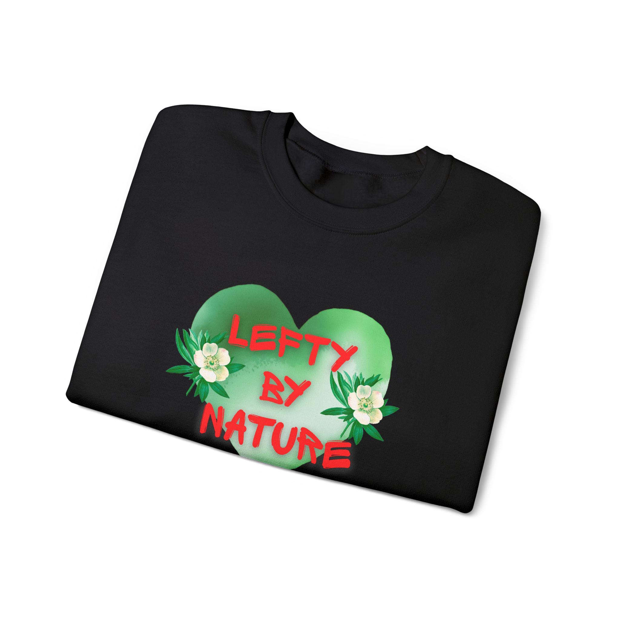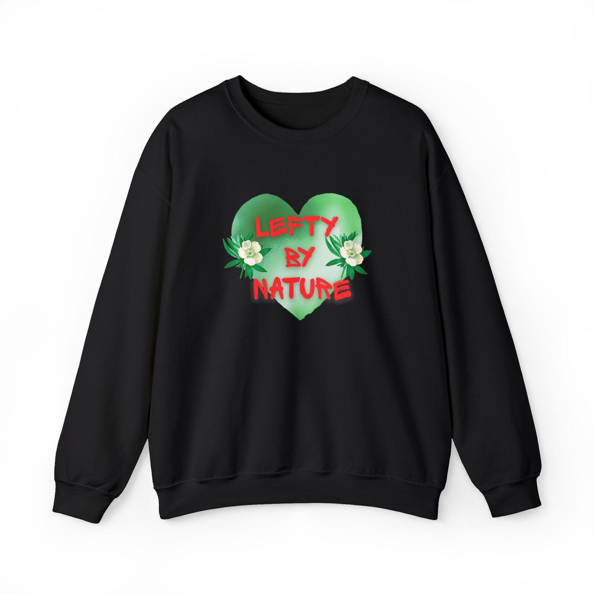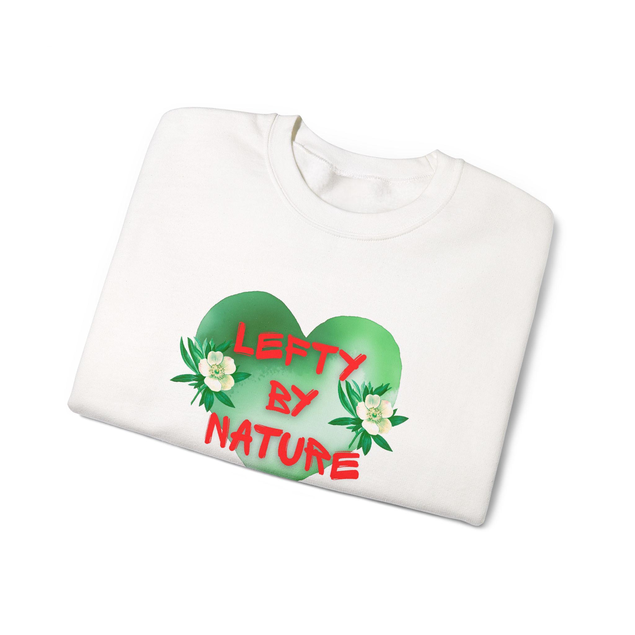 Soft, roomy, and quietly bold — this crewneck wraps you in a familiar comfort while making a playful statement. A leafy green heart centers the chest, accented by small white blooms and the hand-lettered phrase "Lefty By Nature" in organic, slightly rough red lettering. The relaxed silhouette and medium-heavy knit feel like an old favorite from the first wear. Wear it on cool mornings with coffee on the porch, during errands through town, or layered for an evening by the bonfire. The look leans botanical and whimsical, so it blends easily into nature walks, casual meetups with friends, or low-key pride moments where personality matters more than flash.