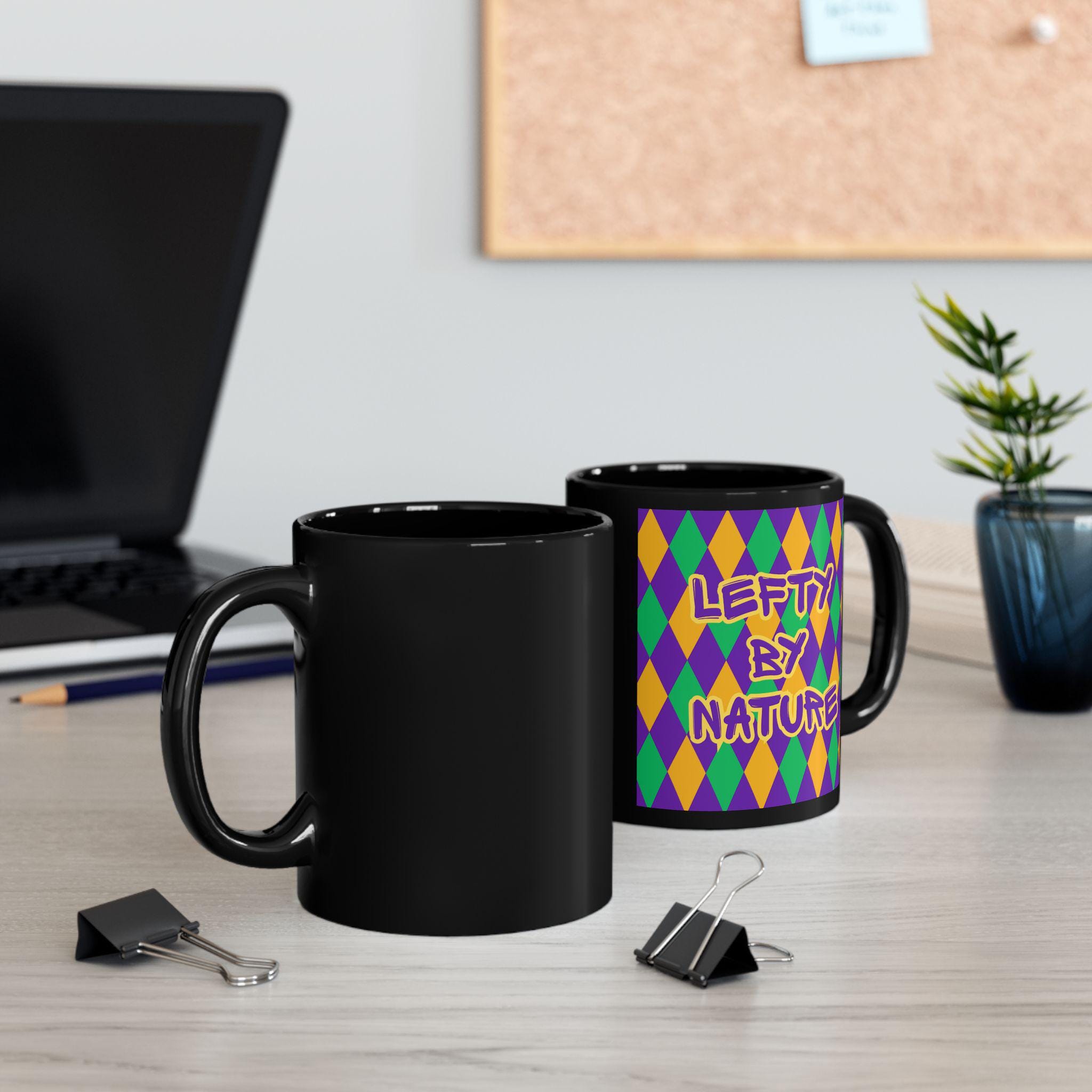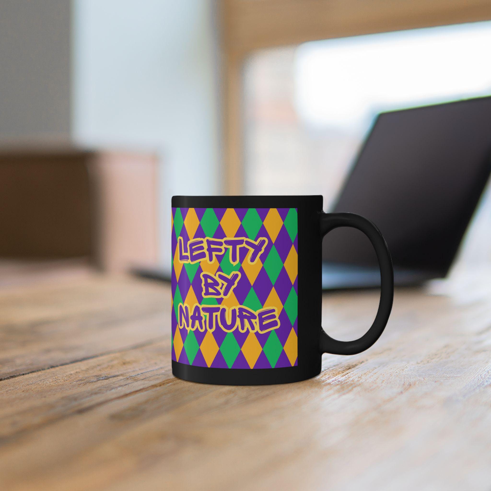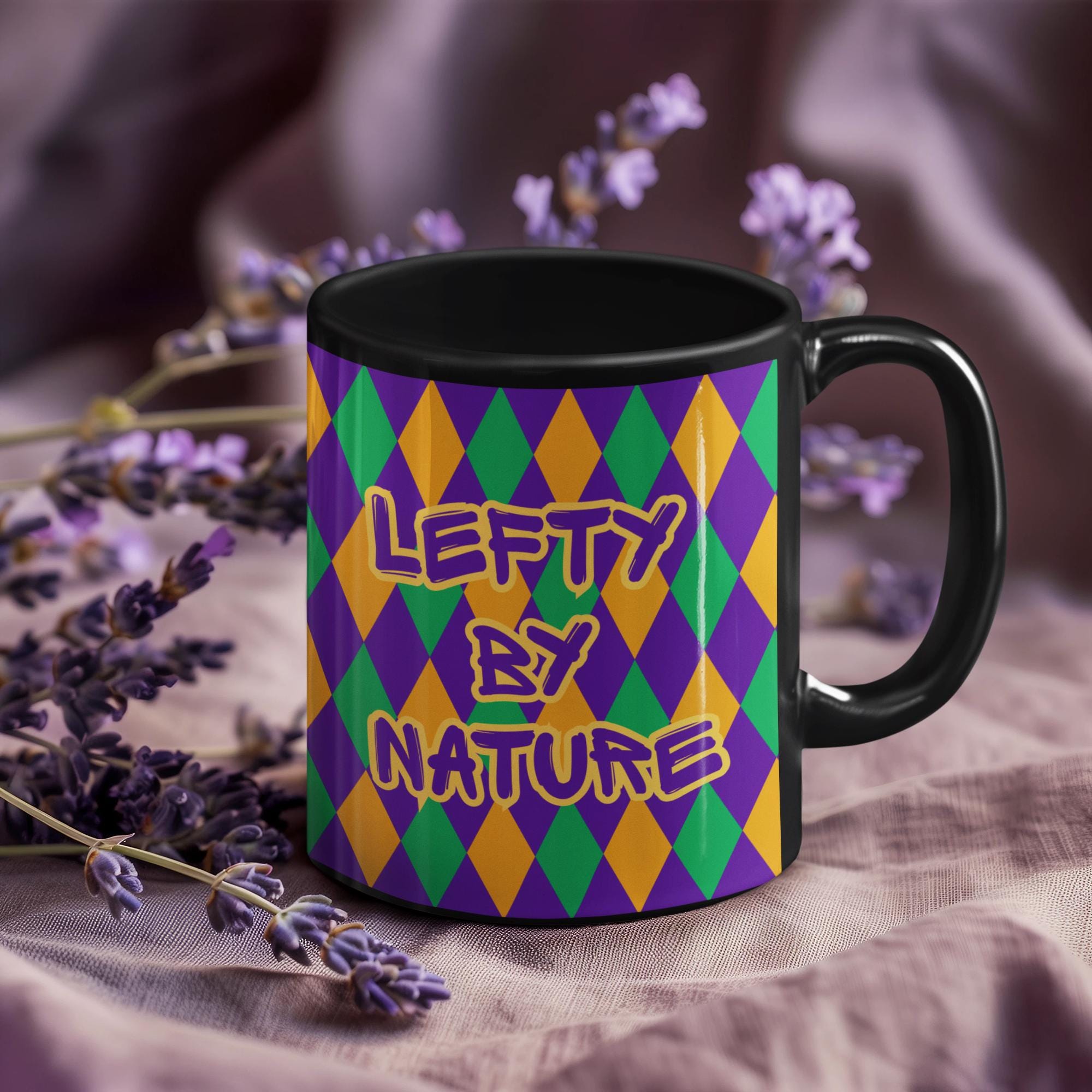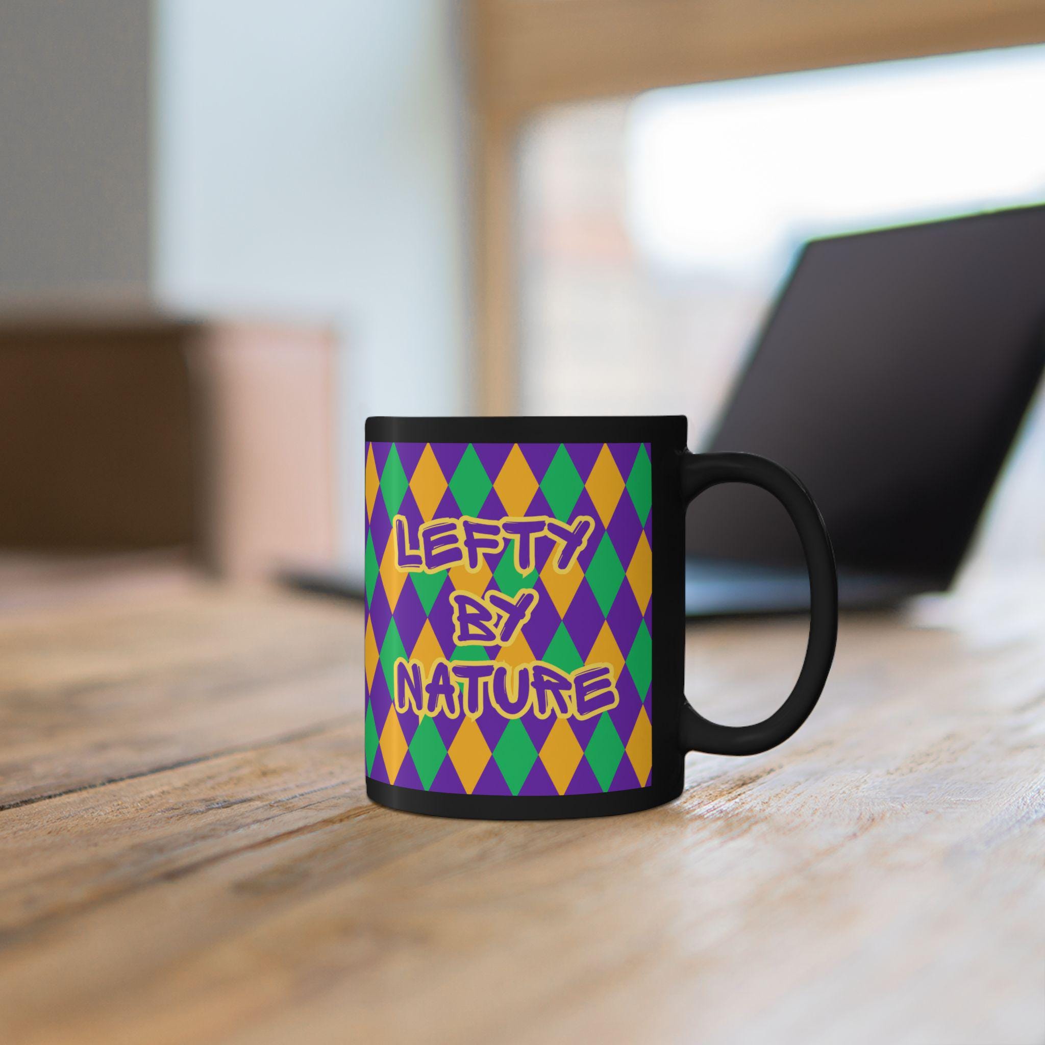 Bright, bold, and full of personality — this black ceramic mug brings a playful splash of color to slow mornings and busy workdays alike. The vivid harlequin pattern in purple, green, and gold wraps around the glossy black surface, while the cheeky “Lefty By Nature” lettering adds a wink of self-expression. It feels warm in your hands thanks to the easy C-shaped handle and holds enough coffee or tea to get you through creative bursts or long meetings. Dishwasher- and microwave-safe, it’s built for everyday use without losing its vibrant print. Use it at your desk, on the kitchen counter, or as a fun accent on a shelf — it blends humor and style in a way that speaks to someone who embraces their left-handedness with pride.